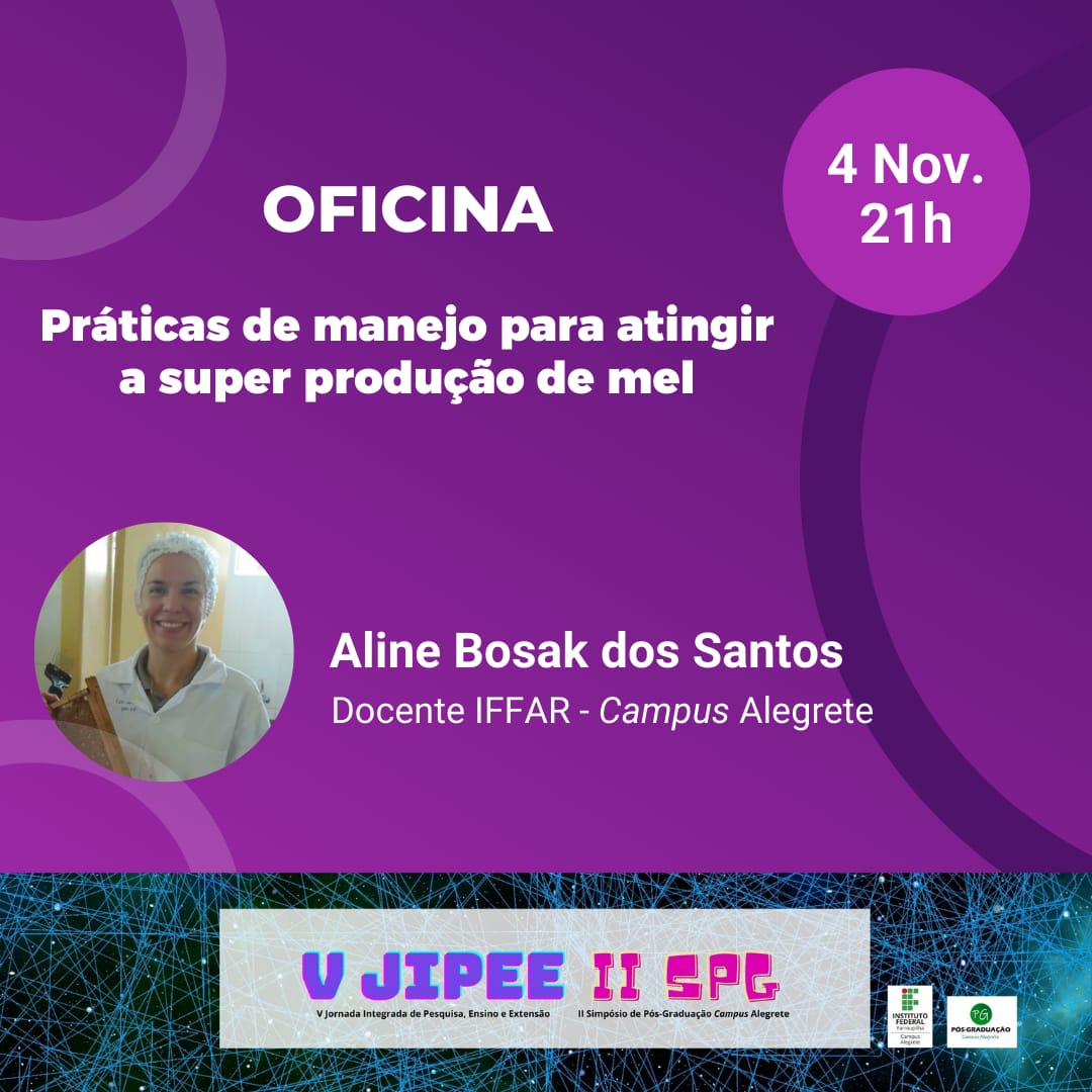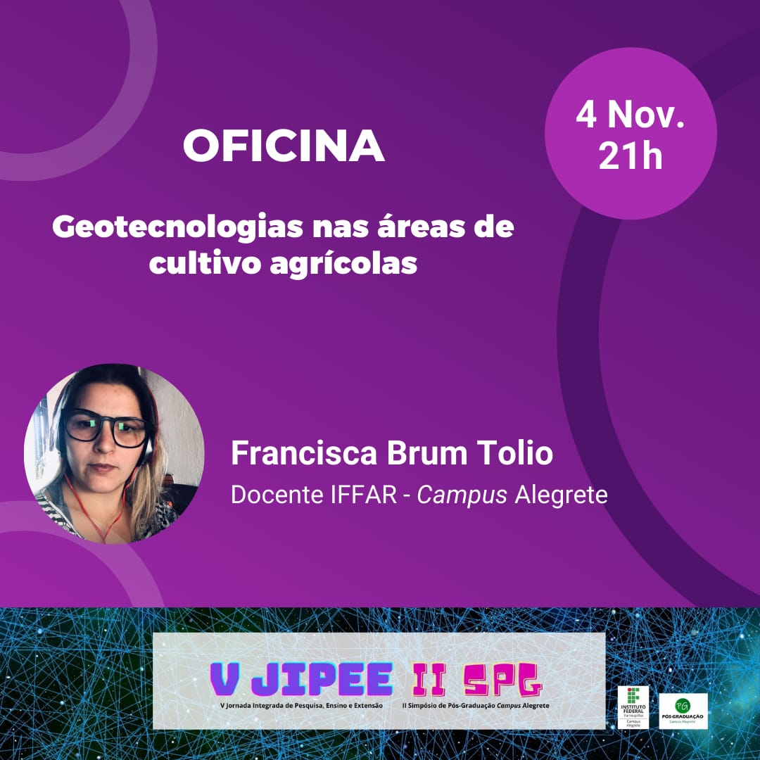 Estão abertas as incrições para as palestras e as oficinas da V Jornada Integrada de Pesquisa, Ensino e Extensão (JIPEE) e II Simpósio de Pós-Graduação (SPG) do IFFar - Campus Alegrete.