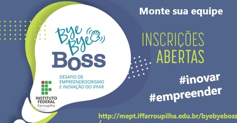 Está aberto o período de inscrições, até o dia 23 de agosto, das equipes para o BYE BYE BOSS - DESAFIO DE EMPREENDEDORISMO E INOVAÇÃO DO IFFAR. O Bye Bye Boss tem por objetivo premiar ideias de projetos empreendedores e inovadores visando o desenvolvimento local e regional.