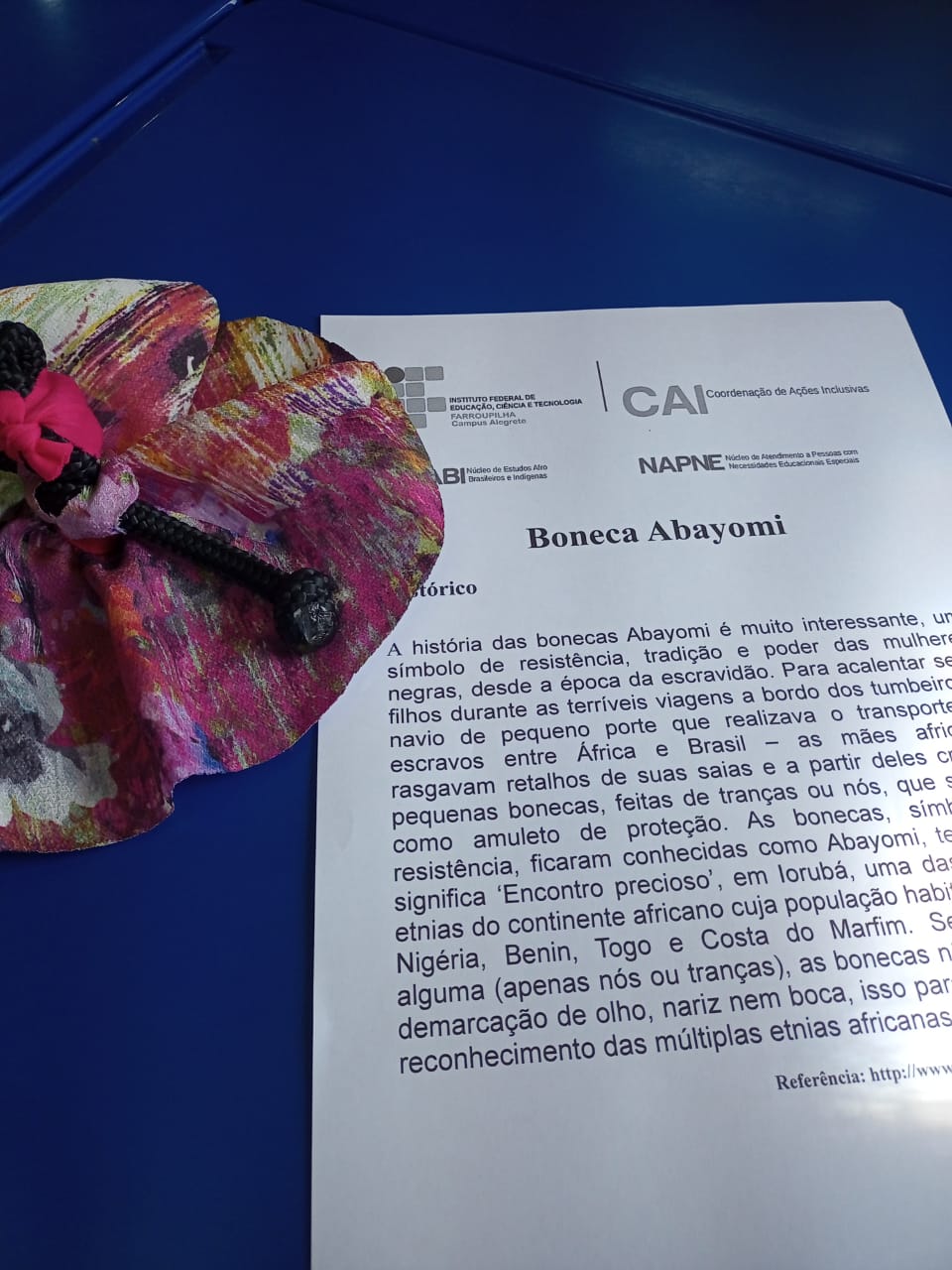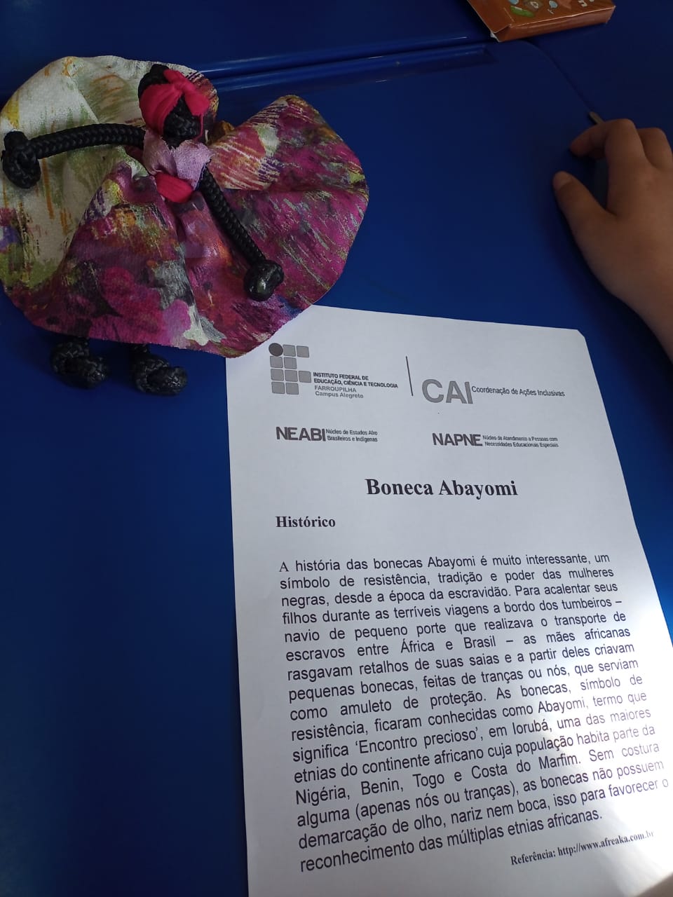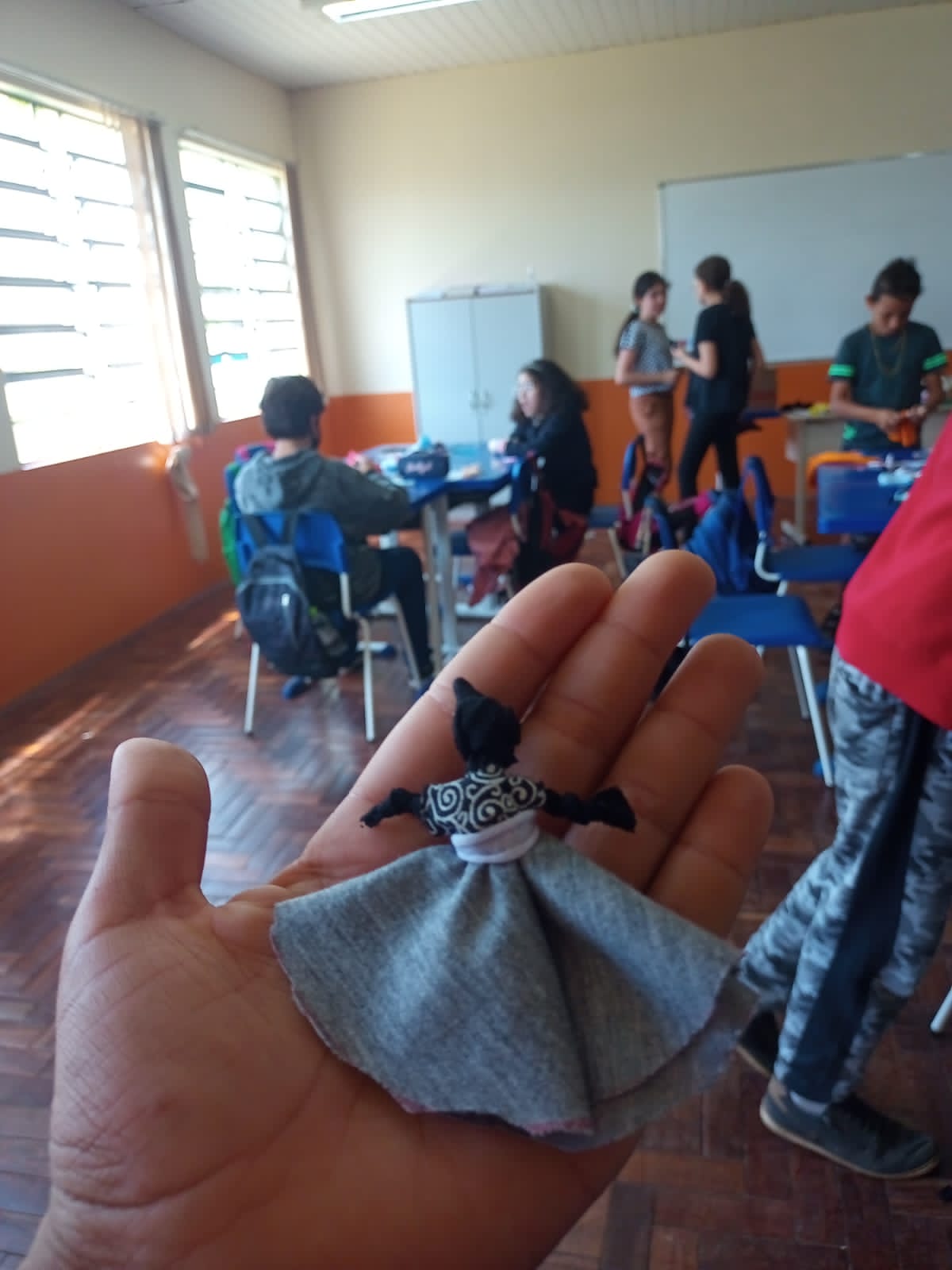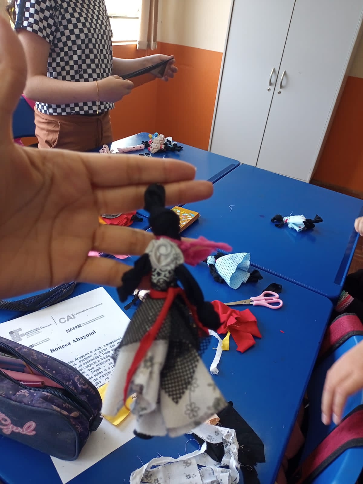No inicio do mês de novembro, o servidor Aires Dornelles foi convidado, através do Núcleo de Estudos Afro-brasileiro e indígena, do Campus Alegrete, para ministrar a oficina sobre "Bonecas Abayomi", na Escola Waldemar Borges, em Alegrete. A oficina foi a primeira a acontecer de forma presencial após a pandemia.