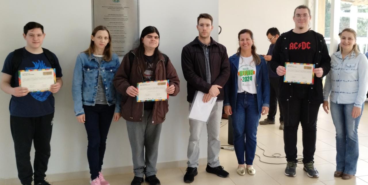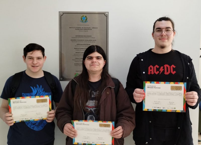 Quatro estudantes do Instituto Federal Farroupilha - Campus Alegrete foram reconhecidos pela sua excelência em Matemática na edição de 2022 da Olimpíada Brasileira de Matemática das Escolas Públicas (OBMEP). Diogo Mainart Monteiro, Henrique Serres Cioqueta, Luiz Felipe Scheuer Gomes (não esteve presente na solenidade) e Murilo de Moura Rodrigues receberam “Menção Honrosa” pelas suas performances nas provas da competição.