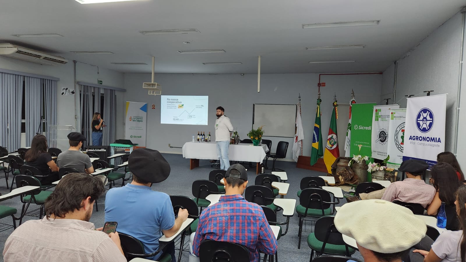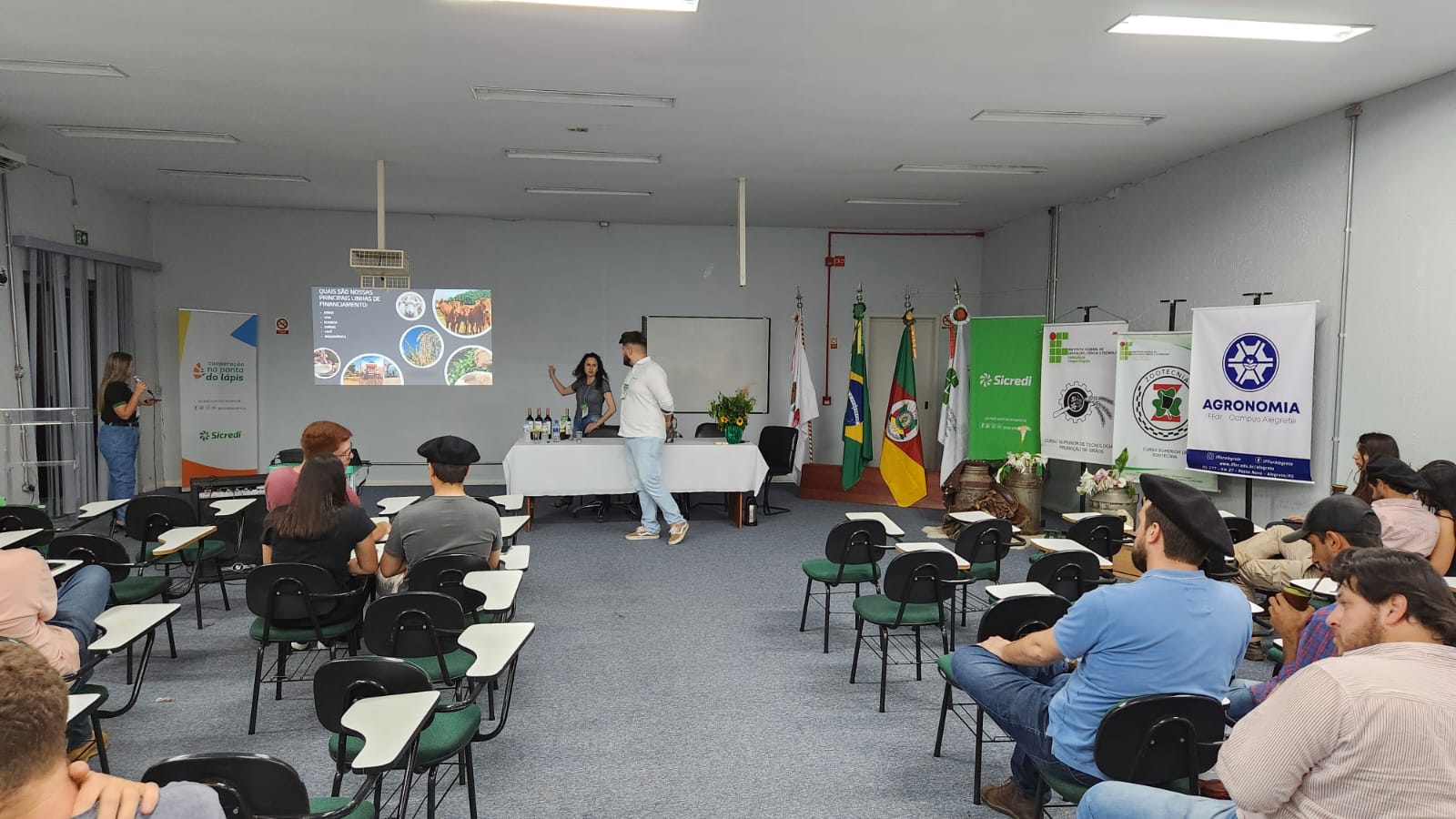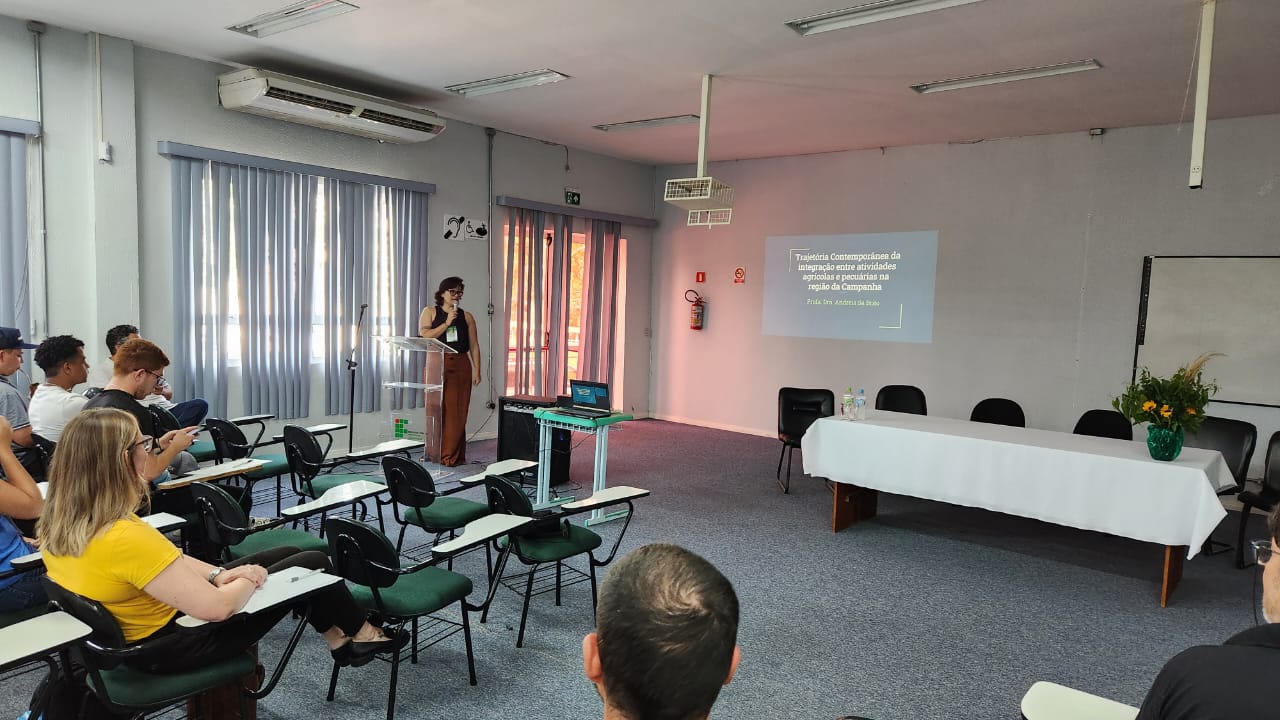 A I Jornada Agrária teve como temas e palestrantes: Trajetória contemporânea da integração entre atividades agrícolas e pecuárias na região da campanha - Andréia Sá Brito; Impacto do Sicredi no agronegócio em Alegrete e educação financeira – Vanessa Frigo e Luciano Ferreira; Inserção do jovem no agro – Raphael Houayek; Irrigação da metade sul no Rio Grande do Sul - Marco Aurélio Sanchotene e Painel de egressos - Ariel Roza e Jerry Adriani Cordeiro de Souza.