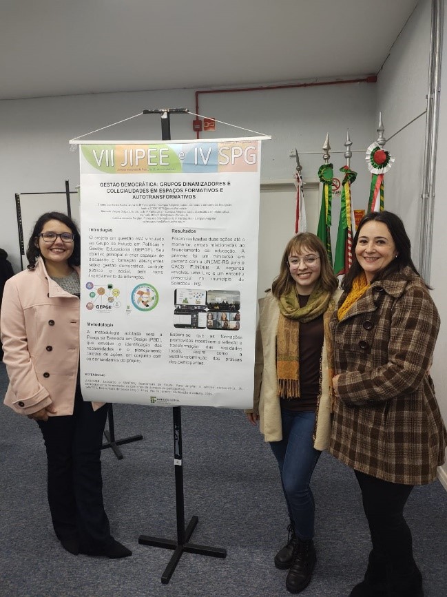 Aconteceu na tarde do dia 13, o encerramento do Projeto de Extensão "Gestão democrática: grupos dinamizadores e colegialidades em espaços formativos e autotransformativos", coordenado pela Prof.ª Calinca Jordânia Pergher e assessorado pelas Bolsistas Manuele Vargas Braga Julio e Beatriz Corrêa da Rocha.