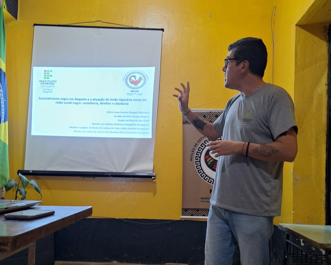 No dia 26 de março, às 19h, o Núcleo de Estudos Afro-Brasileiros e Indígenas (NEABI) do IFFar - Campus Alegrete, em parceria com o Clube União Operária de Alegrete, promoveu a palestra "Associativismo negro em Alegrete e a atuação da União Operária como um clube social negro: resistência, direitos e cidadania". O evento, realizado no hall de entrada do clube e aberto à comunidade, foi conduzido pelo Historiador e Coordenador do NEABI, Márcio Jesus Ferreira Sônego.