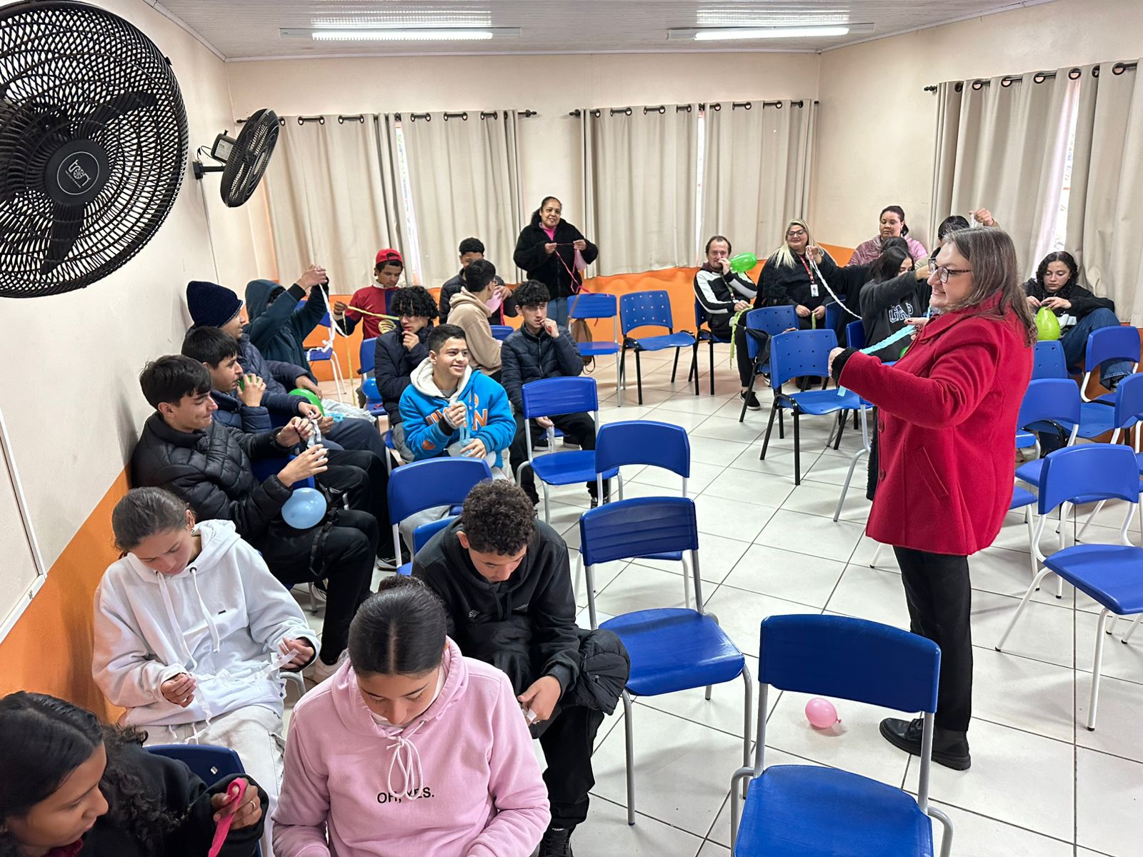 Marileia Marchezan é psicanalista, mestre em Tecnologias Educacionais em Rede pela UFSM, especialista em Psicanálise, Psicopatologia e Psicoterapia do Adolescente, além de possuir formação em Letras. Com mais de 30 anos de atuação na rede estadual de ensino, ela trouxe uma abordagem acolhedora e informativa, promovendo dinâmicas de interação entre os participantes, que incluíram estudantes e profissionais do programa. Confira alguns dos registros da atividade: