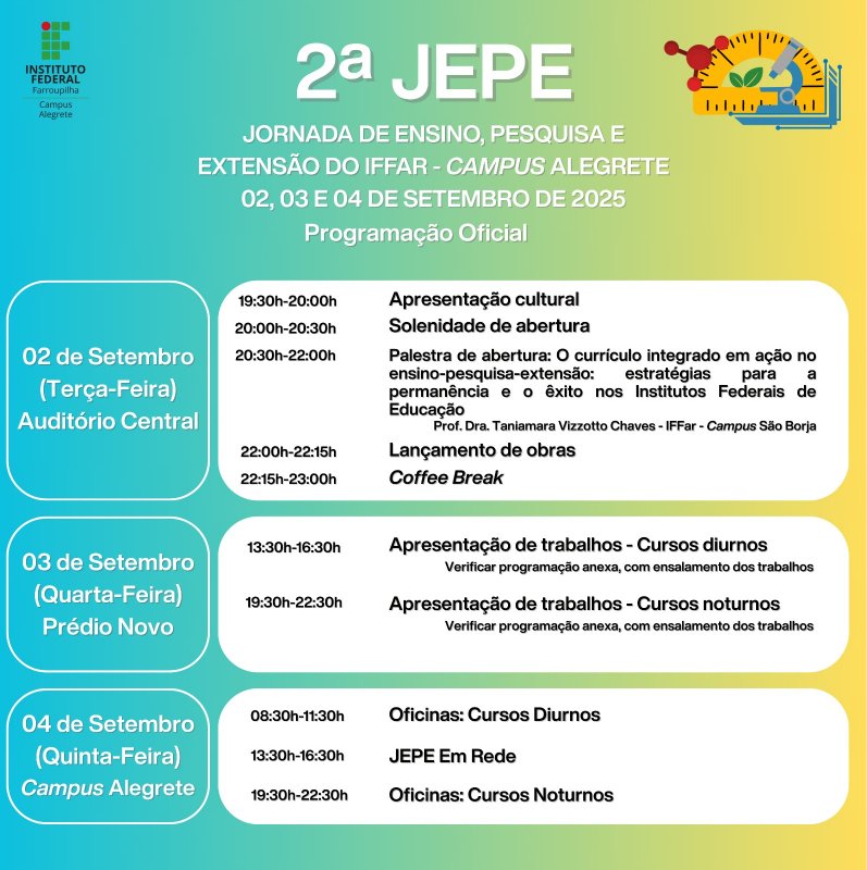 Além da apresentação de pesquisas e projetos, a JEPE contará com palestras, oficinas e momentos de troca de experiências, reafirmando o compromisso do IFFar – Campus Alegrete com a formação integral dos estudantes e com o fortalecimento da educação profissional, científica e tecnológica na região.