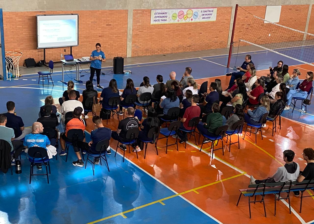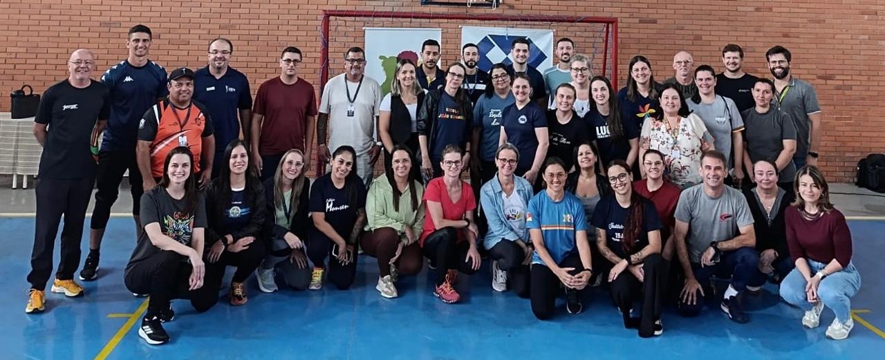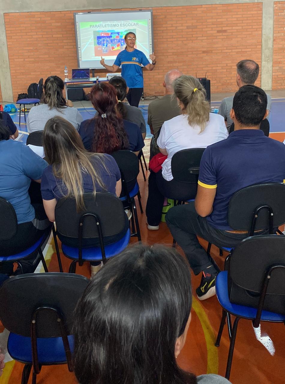 A profissional apresentou na prática formas de aplicação dos exercícios, com demonstrações em vídeos e com a participação dos professores presentes. Também abordou as possibilidades de participação em campeonatos voltados a estudantes com necessidades específicas.