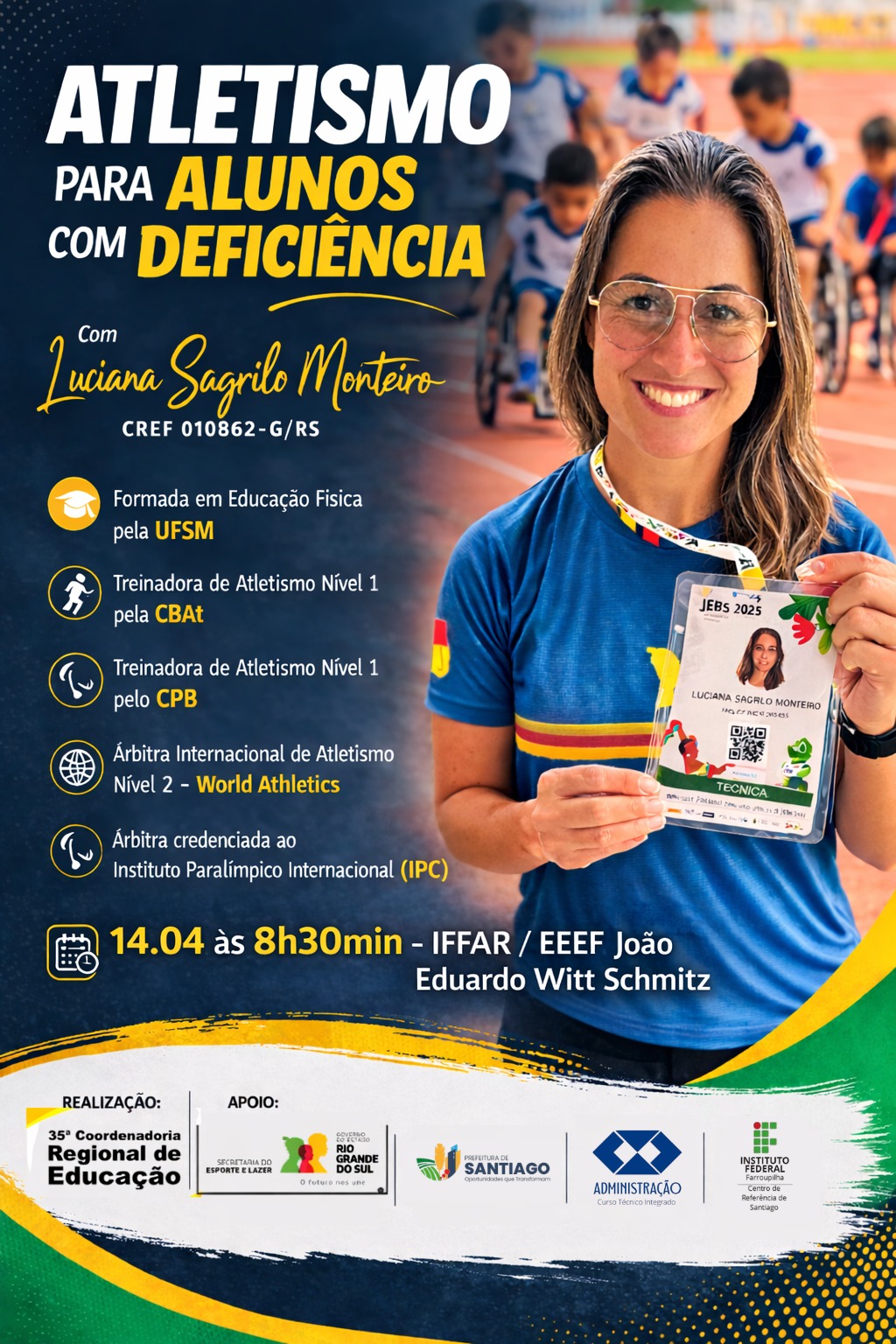 A atividade foi conduzida por Luciana Sagrilo Monteiro, profissional de Educação Física com ampla experiência no atletismo e no paradesporto. Graduada pela Universidade Federal de Santa Maria (UFSM), possui certificações como Treinadora de Atletismo Nível 1 pela Confederação Brasileira de Atletismo (CBAt) e pelo Comitê Paralímpico Brasileiro (CPB), além de atuar como árbitra internacional de atletismo pela World Athletics.