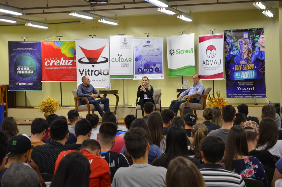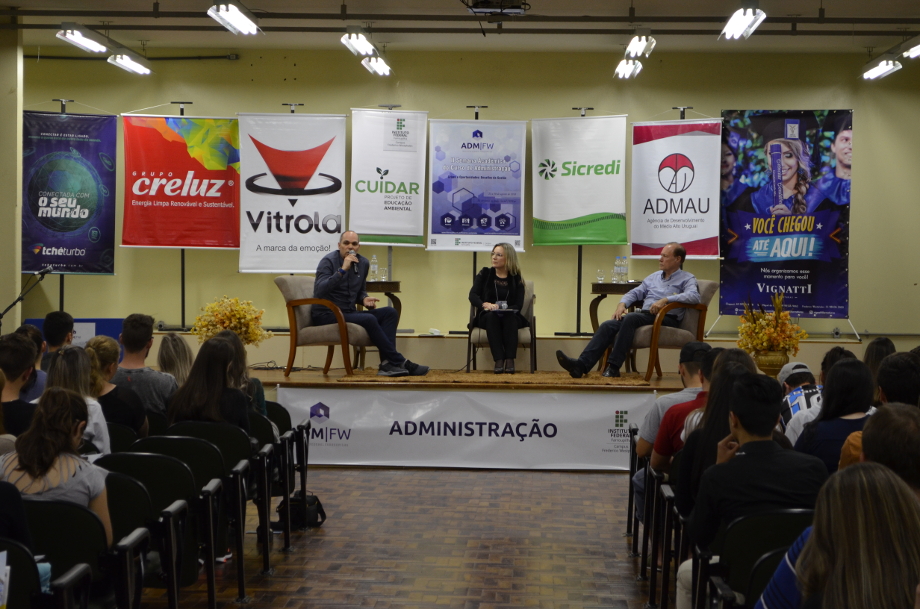 Na última quinta-feira (30) noite de encerramento da II Semana Acadêmica do Curso de Administração o Salão Social do IFFar/FW recebeu os Empresários Ramir Severiano – Diretor Geral da Vitrola e Nelci Bakoff – Presidente da Bakof Tec para o Talk Show – Desafiando o Mercado. As discussões foram moderadas pela Profª do IFSul, Marineiva Manganelli. Os empresários trouxeram reflexões sobre as mudanças do atual cenário político e econômico, e a necessidade de contínua inovação, adaptação e gestão consciente e sustentável.