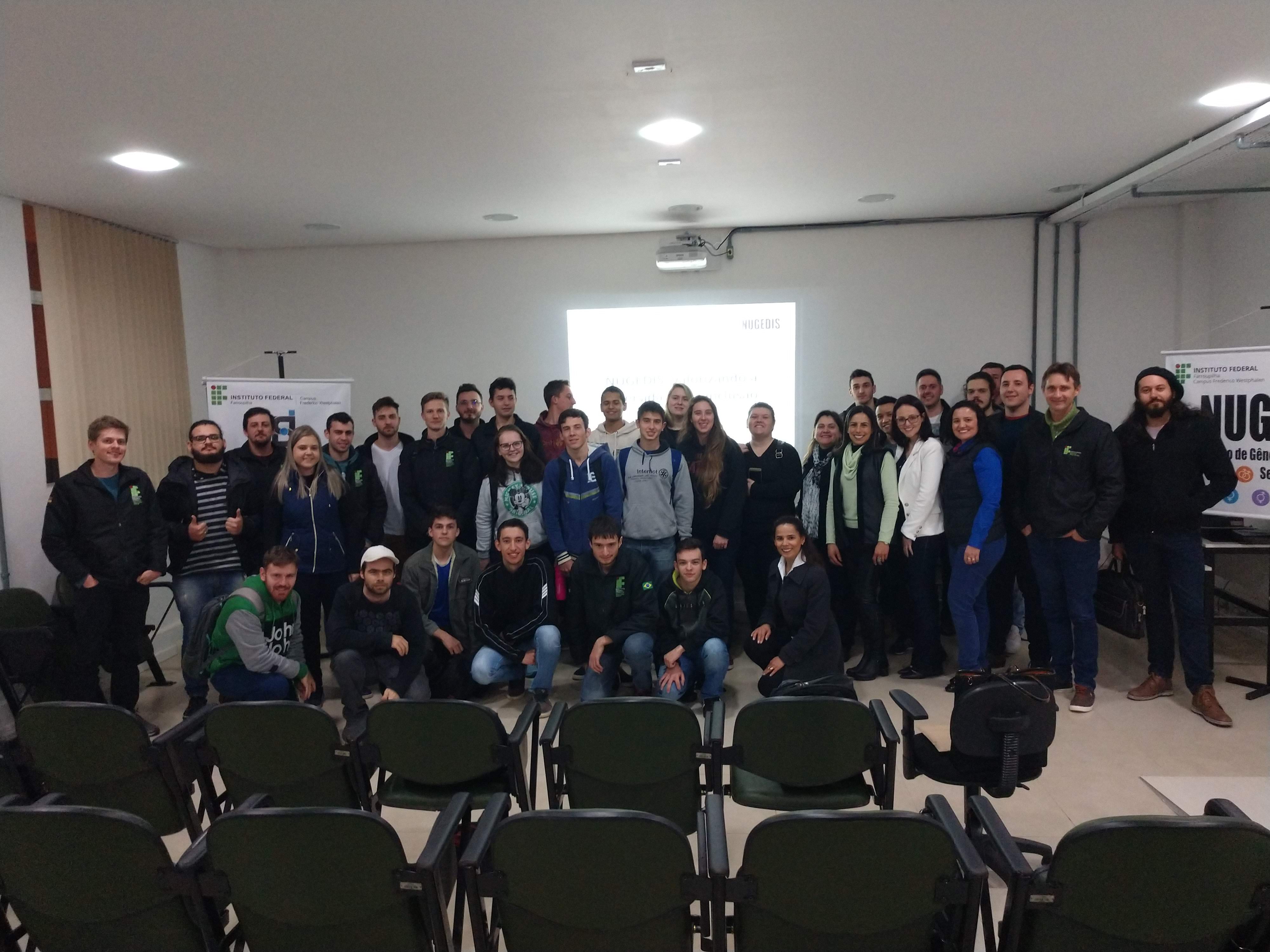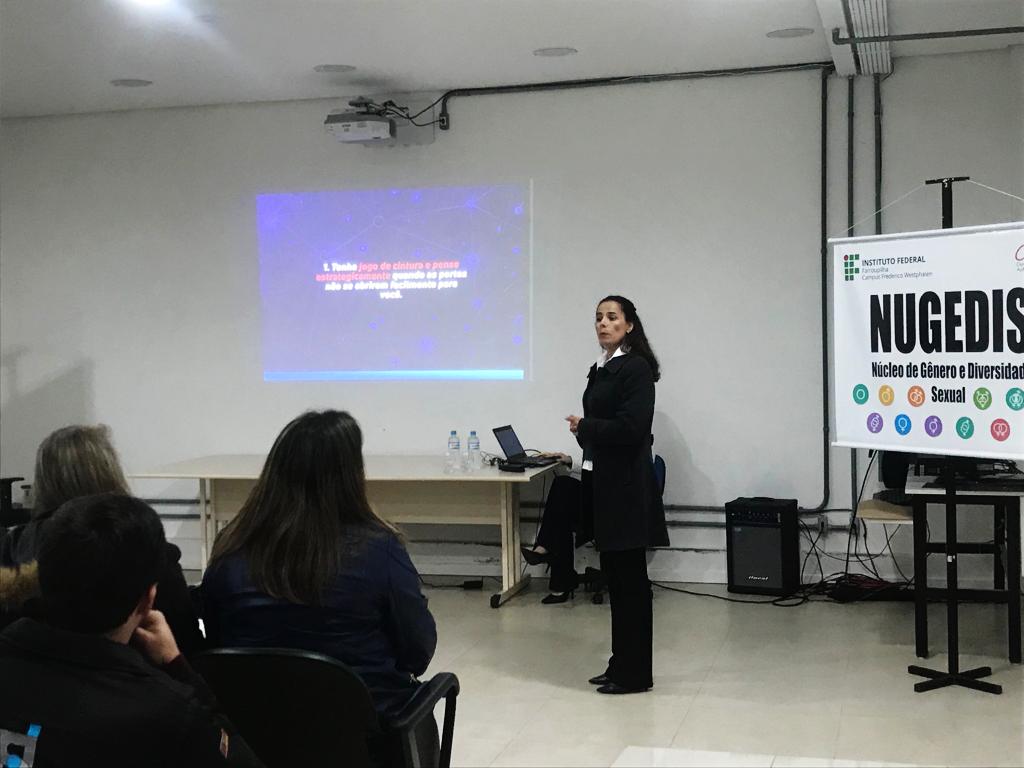 A professora Elis, explicitou o porquê da existência do Nugedis no IFFar e, na sequência, explicou sobre o conceito de assédio e seus tipos. O assunto foi trabalhado de forma contextualizada, com dados do IBGE da população economicamente ativa com o recorte de gênero e com situações do cotidiano incluindo os conteúdos que são publicados nas redes sociais e que, em sua maioria, disseminam o ódio e o preconceito associados a gênero, colocando a mulher em posição de inferioridade.