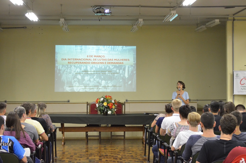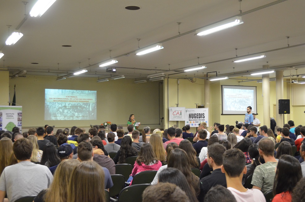 O propósito foi homenagear todas as mulheres do Campus: alunas, servidoras e funcionárias terceirizadas, valorizando os diferentes modos de viver a feminilidade. Deste modo, foi realizada na noite de quinta-feira, dia 07 de março, uma palestra com a Assistente Social Mariana Marques Sebastiany que apresentou a contextualização histórica da data (08 de março), investindo no enaltecimento da mesma como busca permanente de igualdade social e respeito aos diferentes papeis que a mulher assume na sociedade. Além disso, trouxe como pontos de reflexão os problemas atuais enfrentados pelas mulheres como violência doméstica, desigualdade salarial, dupla jornada de trabalho, e a atual reforma da previdência social e suas repercussões na vida das mulheres dentre elas as mulheres do campo.