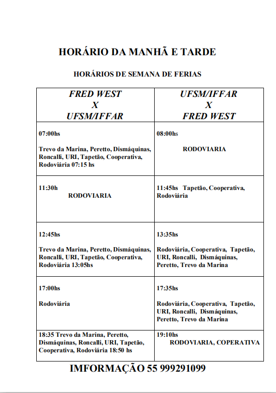 Informamos que o horário de expediente no IFFar Campus Frederico Westphalen durante as duas semanas de recesso, sendo do dia 15 a 26 de julho de 2019, será das 07:30 horas até as 13:30 horas.