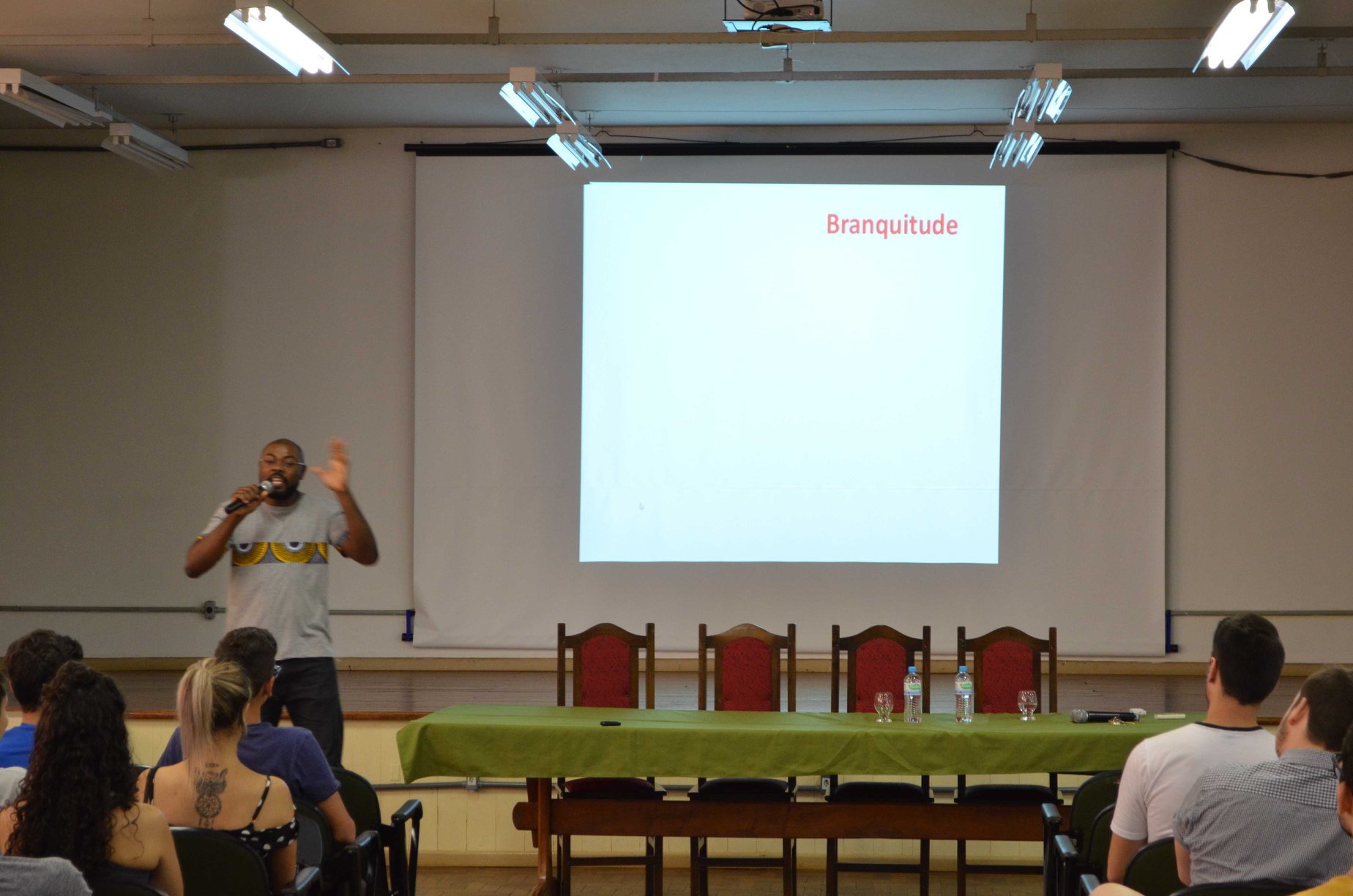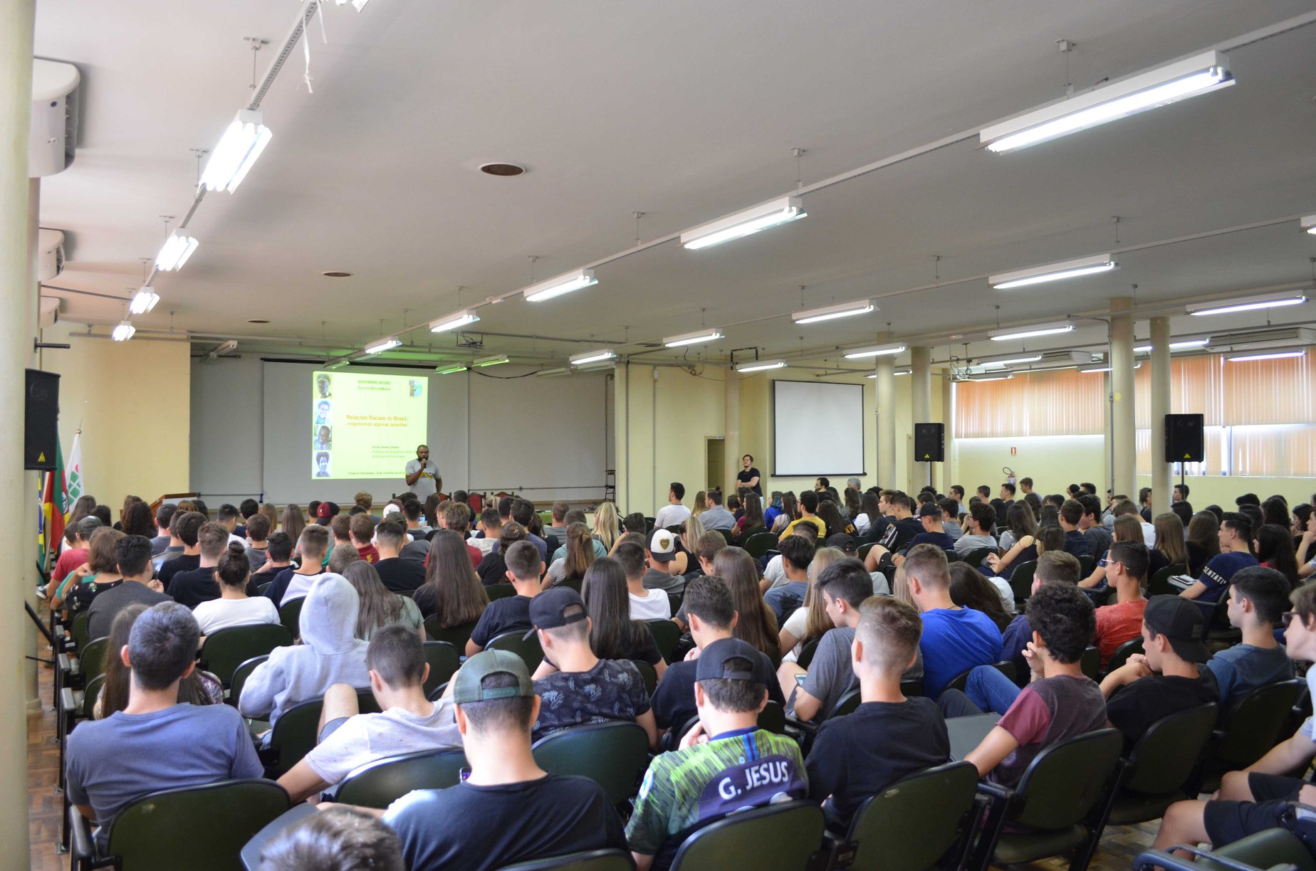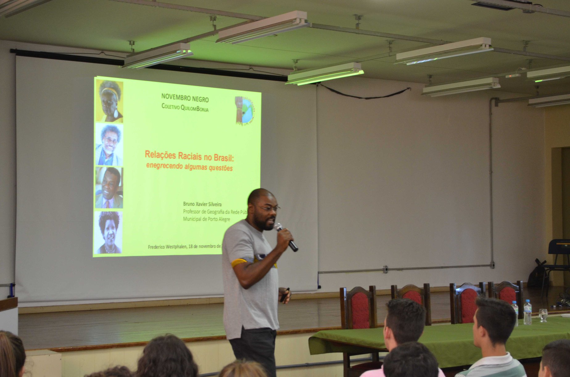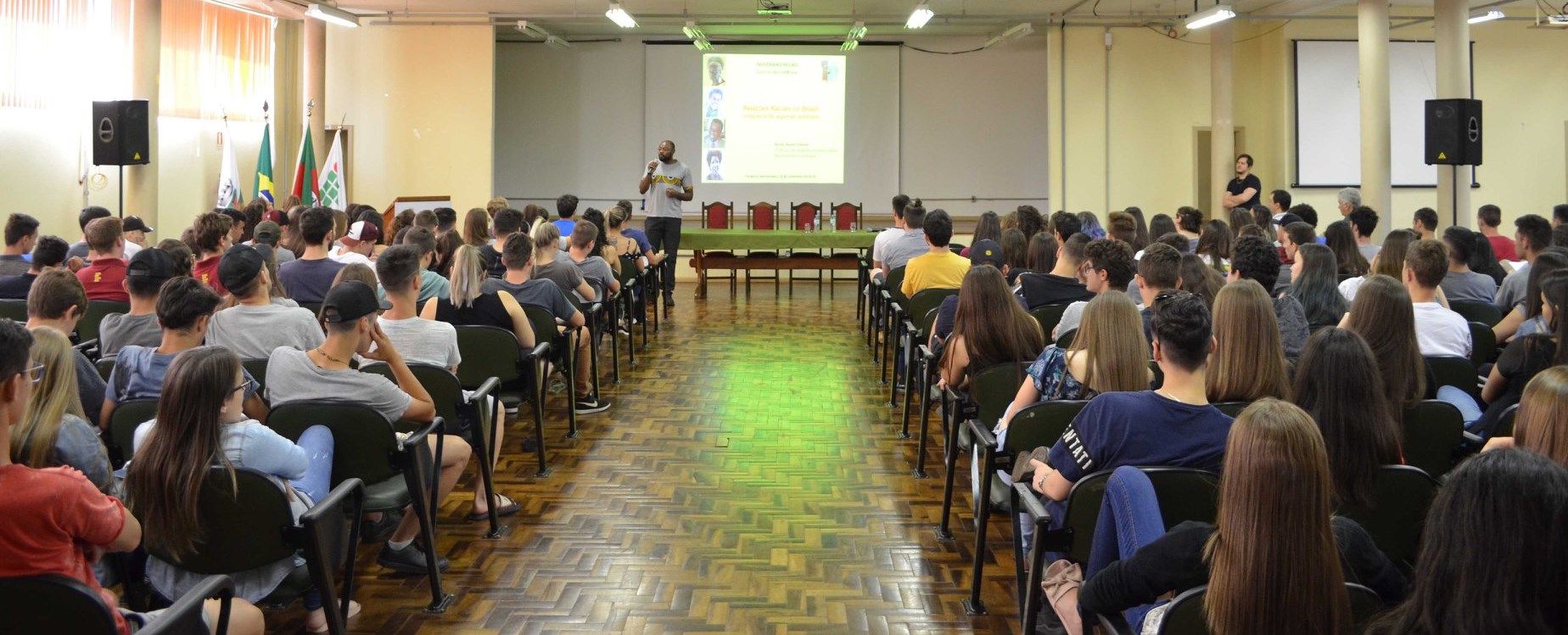 Em especial, o presidente do NEABI, César Augusto González, agradece a visita do professor Bruno, o qual atua na rede municipal de Porto Alegre, em uma escola de periferia. É mestre em geociências pela UFRGS e produziu uma dissertação em que reflete sobre raça e sua relação com a educação. E contribui com uma temática introdutória sobre questões de raça na sociedade brasileira no IFFar-FW.