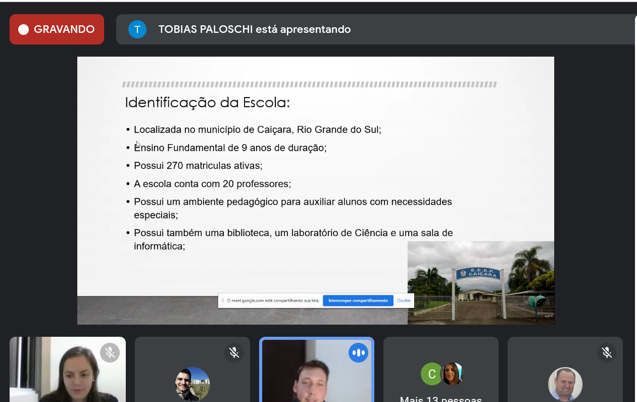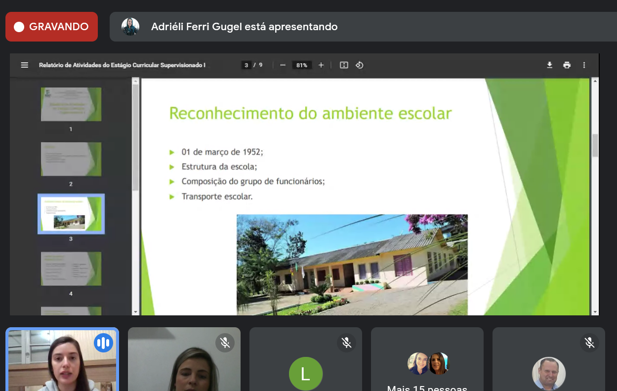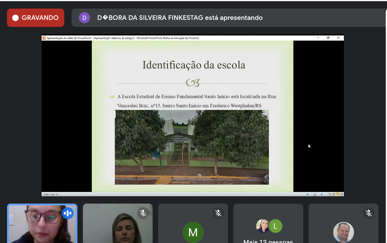 No transcorrer do primeiro semestre letivo do ano de dois mil e vinte e um foi ofertada a primeira disciplina de Estágio Curricular Supervisionado do Curso de Licenciatura em Matemática do IFFar/FW, sob a orientação da Profª. Dra. Ana Queli Mafalda Reis Lauterio e da Profª. Me. Bruna Larissa Cecco. Dentre as atividades desenvolvidas, citam-se: a análise de documentos da escola, a observação e análise de atividades de ensino da disciplina de Matemática nos anos finais do ensino fundamental, a elaboração de relatórios e a apresentação de bancas.