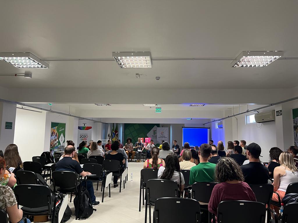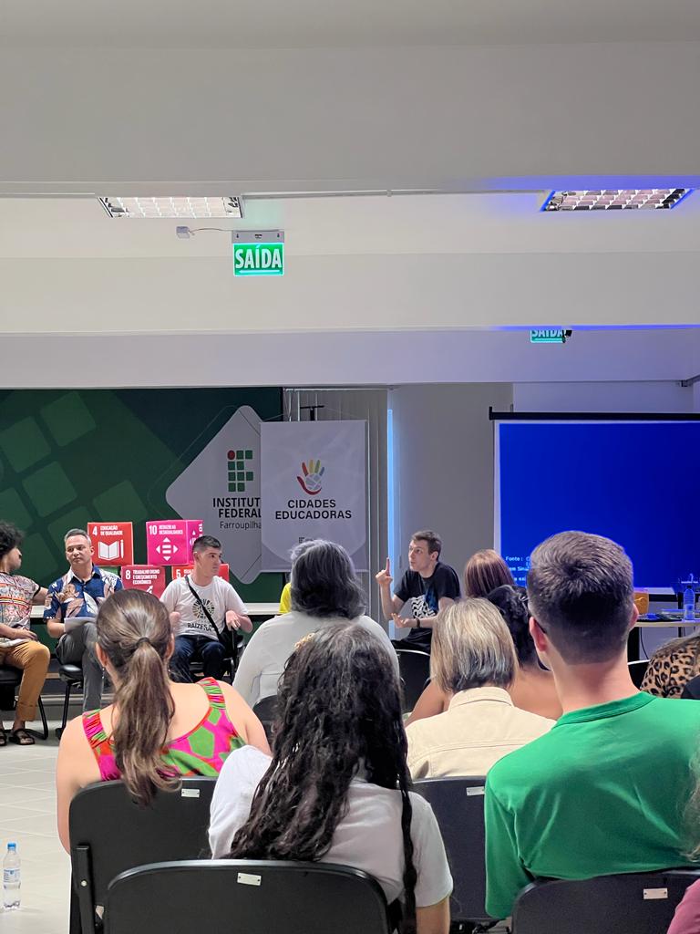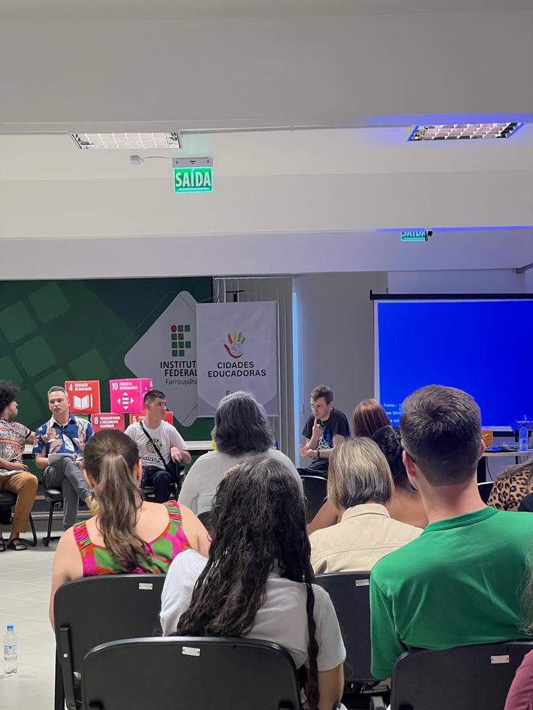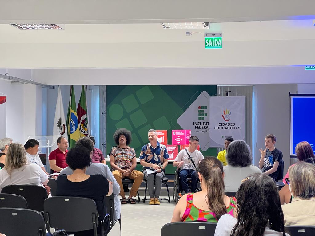Na última quarta-feira, dia 07 de dezembro, o aluno André Gabriel Rockenbach (3º ano do curso Técnico em Informática) participou do Fórum de Extensão para Educação em Direitos Humanos, realizado no Auditório da Reitoria, em Santa Maria. Convidado pela Pró-Reitora de Extensão, Ângela Marinho, o aluno compartilhou sua experiência enquanto sujeito surdo em uma roda de conversa intitulada “Lugar de fala dos estudantes, servidores e comunidade externa sobre a Política de Extensão para a Educação em Direitos Humanos no território de abrangência IFFar”. Em sua fala, o discente expôs as dificuldades e barreiras enfrentadas referentes à comunicação com os ouvintes, bem como suas expectativas frente à recepção da LIBRAS pela sociedade. Participaram também do evento a Coordenadora de Apoio a Pessoas com Necessidades Educacionais Específicas (CAPNE), Angélica Pozzer, e a Coordenadora de Ações Afirmativas, Ariane Avila Neto de Farias.