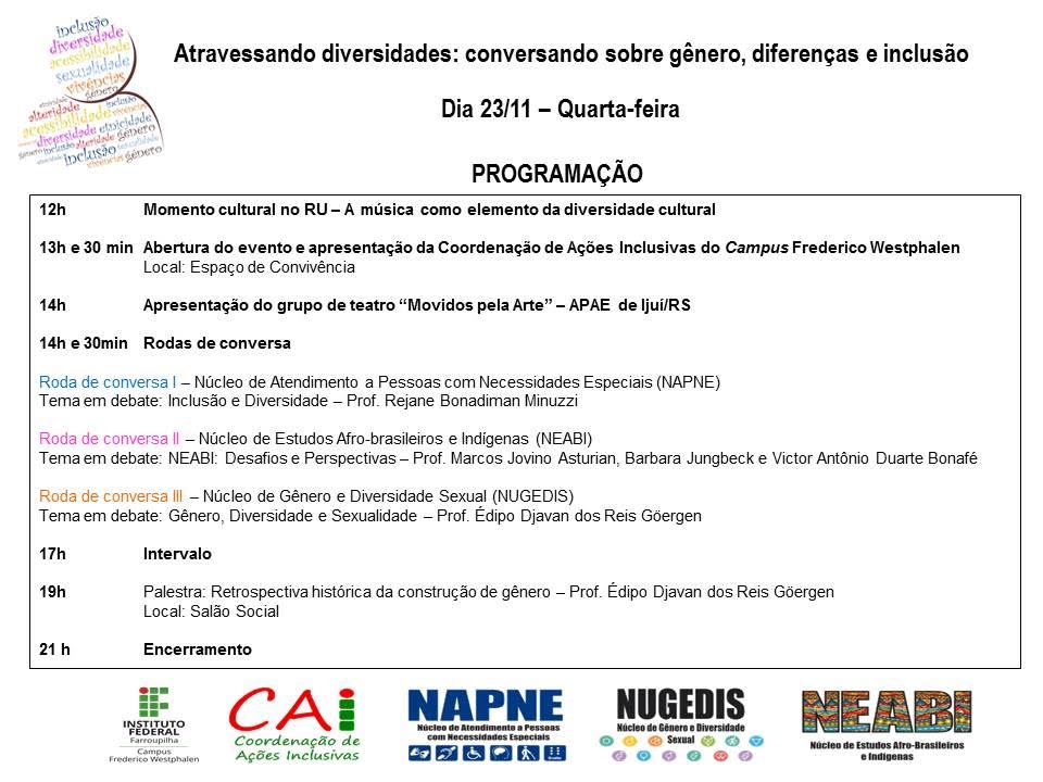 Atravessando diversidades: conversando sobre gênero, diferenças e inclusão - dia 23/11/16 quarta-feira - PROGRAMAÇÃO