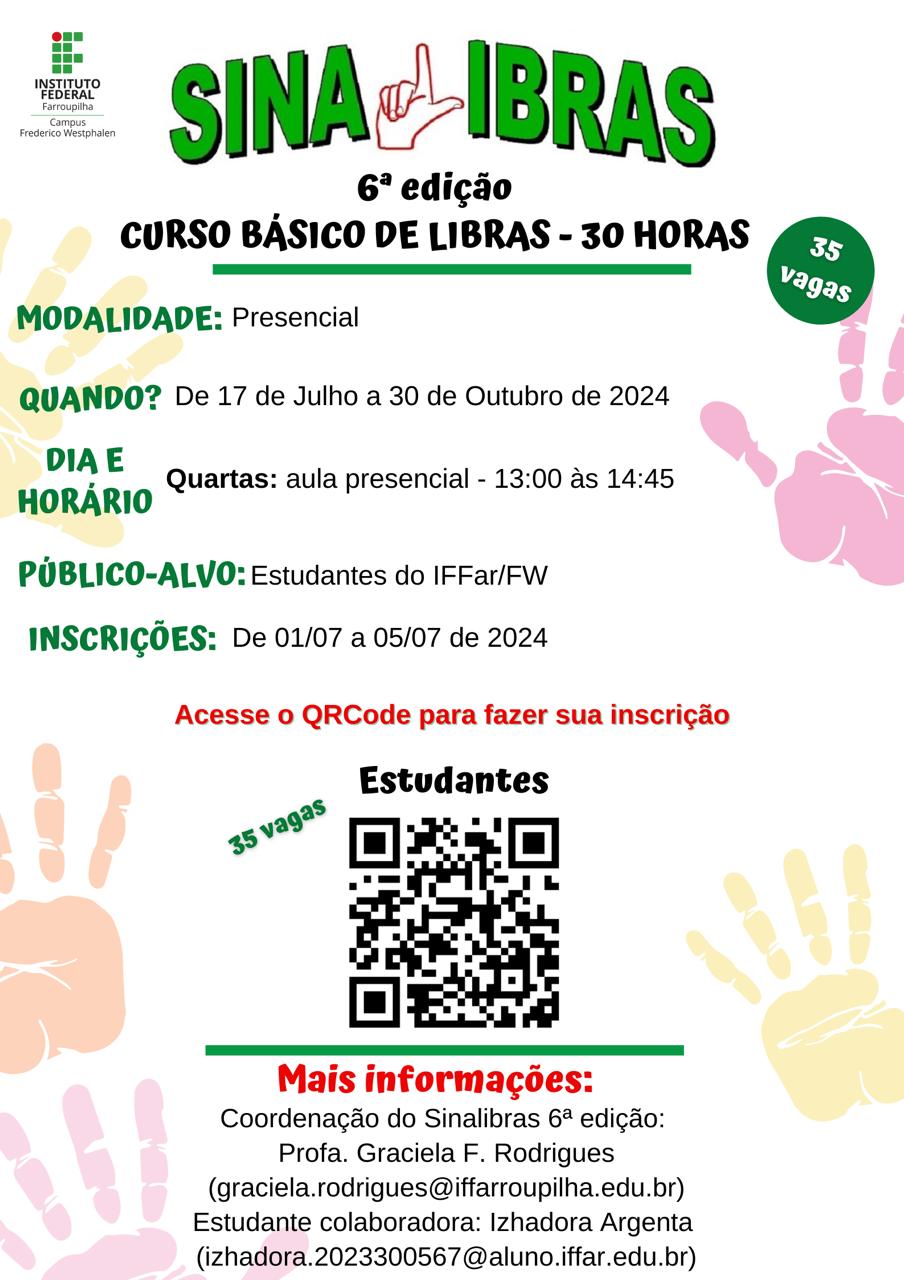 O Projeto de Ensino Sinalibras encerra suas inscrições amanhã, 05/07/2024. O curso destinado aos estudantes do IFFar Campus Frederico Westphalen conta com uma carga horária de 30 horas, distribuídas em 15 encontros presenciais, o curso proporcionará às/aos participantes o estudo e a prática da Libras, articulada aos aspectos que a envolvem como os linguísticos e os culturais.