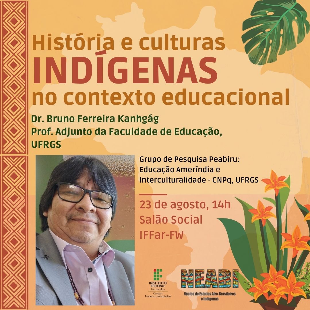 Na próxima sexta-feira, 23 de agosto, o Núcleo de Estudos Afro-Brasileiros e Indígenas (NEABI) do Instituto Federal Farroupilha - Campus Frederico Westphalen, terá o prazer de receber o professor Bruno Ferreira Kaingang. O docente, que atualmente integra o corpo de professores da Universidade Federal do Rio Grande do Sul (UFRGS) e é membro do Grupo de Pesquisa Peabiru: Educação Ameríndia e Interculturalidade, abordará temas relacionados à educação indígena e compartilhará estratégias pedagógicas para o trabalho com alunos indígenas.
