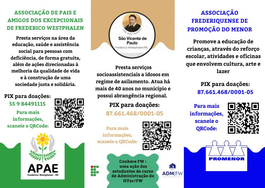 Estudantes do sétimo semestre do Curso de Bacharelado em Administração do IFFar – Campus Frederico Westphalen vivenciaram na prática, o impacto da extensão por meio da disciplina de Seminários de Extensão, ministrada ao longo do primeiro semestre de 2025 pela professora Ana Claudia da Rosa. Com foco na aproximação entre o IFFar e a comunidade local, os acadêmicos promoveram diversas atividades em escolas e instituições da região. As ações tiveram como objetivos principais contribuir com o desenvolvimento social e educacional de estudantes do ensino médio, fortalecer o vínculo com a sociedade, além de auxiliar na divulgação dos cursos de graduação ofertados pelo IFFar. Inserido nesse contexto, os estudantes Alexssandro Da Costa, Camila Hettwer Pinto e Maria Victória Wiker da Silva conduziram a ação de extensão na Escola Cardeal Roncalli, em Frederico Westphalen/RS. O objetivo foi aproximar os adolescentes dos conceitos básicos da administração de forma prática e acessível. Para alcançar isso, os estudantes realizaram uma abordagem dinâmica, utilizando questionários reflexivos que incentivaram o pensamento crítico e promoveram discussões significativas. Na mesma escola, as estudantes Amanda de Vargas e Débora Vitória Neitke realizaram ação com o propósito de aproximar os estudantes dos conceitos fundamentais de marketing, de forma acessível, prática e contextualizada. A ação também foi realizada na cidade de Palmitinho/RS, no Instituto Estadual de Educação 22 de Maio, por meio dos estudantes Éverton da Silva e Marco Antônio Zancan. O objetivo da ação foi, além de divulgar os cursos do IFFar, orientar os estudantes na construção de currículos para concorrer a vagas no mercado de trabalho. As acadêmicas Luísa Estela Franco, Raquel Taffarel Borges e Vanessa Andriéli promoveram ação de extensão na Escola Estadual de Ensino Médio Mathias Balduino Huppes, localizada na cidade de Cristal do Sul/ RS. Diante disso, a ação apresentou como objetivo principal divulgar o IFFar/FW para a comunidade externa, especialmente de estudantes do ensino médio, por meio da apresentação dos cursos de graduação ofertados pela instituição. Essa iniciativa buscou não apenas divulgar as possibilidades de formação acadêmica, mas também fortalecer o vínculo entre o IFFar e a sociedade, promovendo o acesso à educação pública, gratuita e de qualidade. As estudantes Geovana Taschetto de Borba, Thalia Taíse da Silva e Roberta Argenta conduziram a ação com alunos da Escola Estadual de Ensino Médio Danilo Irineu Daris, localizada na cidade de Rodeio Bonito/RS. O objetivo geral da oficina “Liderança e Trabalho em Equipe” foi desenvolver as habilidades nos participantes, fortalecendo a capacidade de liderança e o trabalho em equipe, e promoveu a aproximação dos estudantes da escola com o ambiente acadêmico do IFFar/FW. Os estudantes Rhyana Campos, Cisser André Appel e Jonas Eduardo da Silva elaboraram e executaram o projeto “Conhece Frederico”, tendo como objetivo promover informações acerca de três entidades filantrópicas do município de Frederico Westphalen: a Associação de Pais e Amigos dos Excepcionais de Frederico Westphalen (APAE), a Associação Frederiquense de Promoção do Menor (PROMENOR) e o Lar dos Idosos São Vicente de Paulo. A fim de aproximar a população das entidades citadas e propagar conhecimento sobre seu funcionamento e sua importância, a ideia do projeto foi realizar publicações na rede social Instagram, por meio do perfil dos Cursos de Administração do IFFar/FW (@adm_iffarfw). Além disso, o projeto desenvolveu folders que foram distribuídos em pontos movimentados da cidade, como postes no caminhódromo, murais de empresas e também no mural do campus. O público-alvo da ação foi a população da cidade de Frederico Westphalen e região, que possuem acesso às redes sociais. Para garantir a visibilidade dos posts, os integrantes compartilharam com seguidores em comum, e o próprio perfil utilizado para a publicação já detinha engajamento conforme sua atividade na rede social. Para isso, foram utilizados conceitos de marketing e gestão de projetos, permitindo que os alunos colocassem em prática os aprendizados do Curso de Administração, ao mesmo tempo em que colaboravam com a comunidade local. Portanto, essas iniciativas evidenciam o compromisso social do Curso de Bacharelado em Administração do IFFar/FW com a comunidade de Frederico Westphalen e região. Para os estudantes que conduziram as ações, os projetos de extensão desenvolvidos vão além da sala de aula: “A participação em projetos de extensão tem um impacto significativo na nossa formação profissional, pois nos oferece a oportunidade de aplicar na prática os conhecimentos adquiridos ao longo do curso. Além disso, desenvolvemos diversas habilidades essenciais para o mercado de trabalho.” Entre os principais aprendizados, os próprios estudantes destacam: “Trabalho em equipe, planejamento, organização e comunicação. Também aprendemos a adaptar a linguagem técnica para torná-la acessível ao público, além de aprimorar nossa liderança, gestão do tempo e capacidade de resolver problemas.” Desse modo, as ações desenvolvidas na disciplina de Seminários de Extensão reforçam a importância da extensão como conexão entre o conhecimento acadêmico e as transformações sociais, promovendo experiências enriquecedoras para quem aprende e para quem ensina. Da mesma forma, essas ações também trouxeram contribuições importantes para as instituições envolvidas. O Curso de Bacharelado em Administração parabeniza os estudantes pelo comprometimento e pela dedicação na realização das atividades. Do mesmo modo, o Curso agradece imensamente a acolhida oferecida aos nossos estudantes e o envolvimento das instituições nas ações de extensão. Por fim, espera-se que essas experiências tenham 