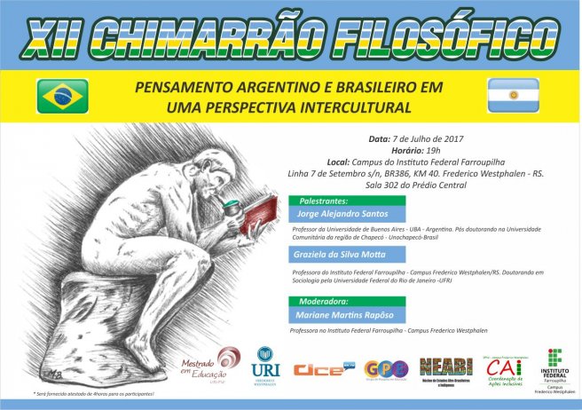 A 12º edição do Chimarrão Filosófico, promovido pela URI, será aqui no Instituto Federal Farroupilha Campus Frederico Westphalen com mediação da Coordenação de Ações Inclusivas (CAI) e do Núcleo de Estudos Afro-Brasileiros e Indígenas (NEABI). E discutirá a interculturalidade a partir de exemplos da realidade brasileira e argentina com os professores Jorge Alejandro Santos, da Universidade de Buenos Aires e da professora Graziela da Silva Motta do IFFar/FW.