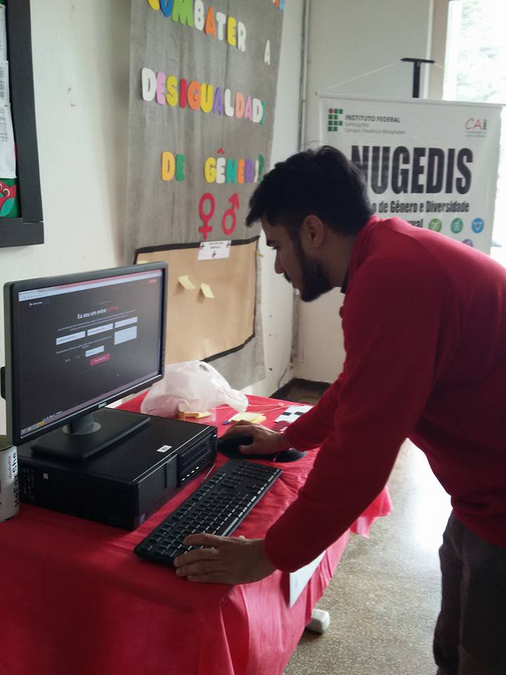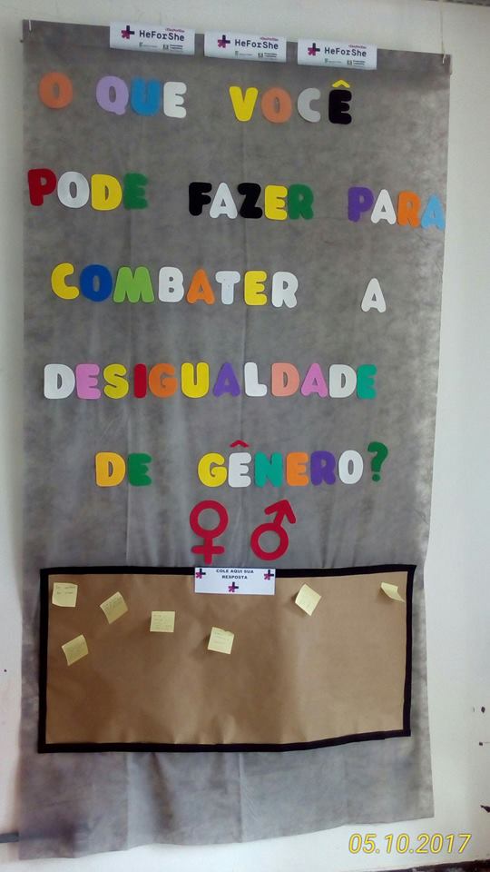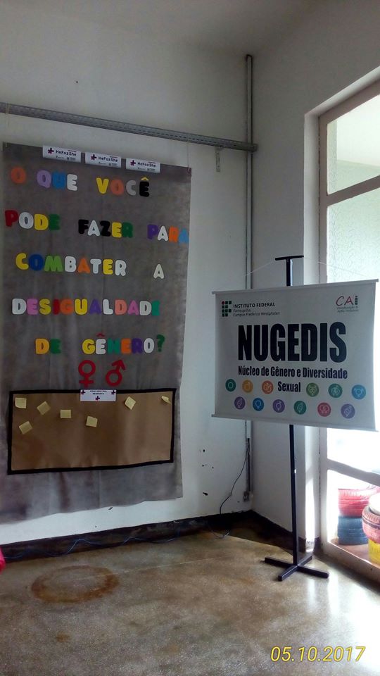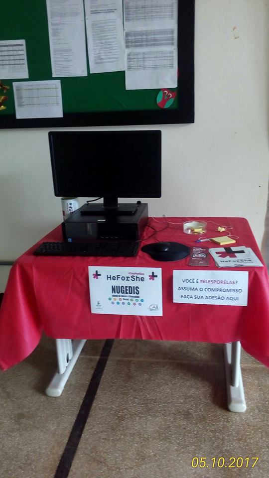 O movimento em nosso Campus é organizado pela Coordenação de Ações Inclusivas e o Núcleo de Gênero e Diversidade Sexual (NUGEDIS). Durante essa quinta-feira, 05, várias ações estão sendo realizadas entre elas a entrega de panfleto do #ElesporElas e uma fita de pulso alusiva ao movimento, adesão espontânea à campanha “Você é #ElesPorElas? <http://www.heforshe.org/pt>. Com preenchimento de dados pela internet com distribuição de botons para quem aderir, exibição do vídeo: #ElesporElas Campus FW. Relatos de servidores e alunos a partir da pergunta: “O que você pode fazer para contribuir com a igualdade de gênero?” e uma Oficina de Autodefesa com o Técnico Administrativo Lucimauro Fernandes de Melo para alunas e servidoras.