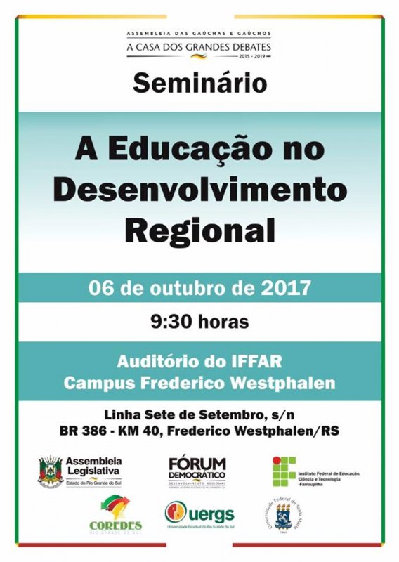 O Instituto Federal Farroupilha Campus Frederico Westphalen sedia nesta sexta-feira, 06, o seminário “A Educação no Desenvolvimento Regional”, promovido pela Assembleia Legislativa do Estado do Rio Grande do Sul”. O seminário será no Salão Social do IFFar/Fw às 9h30.