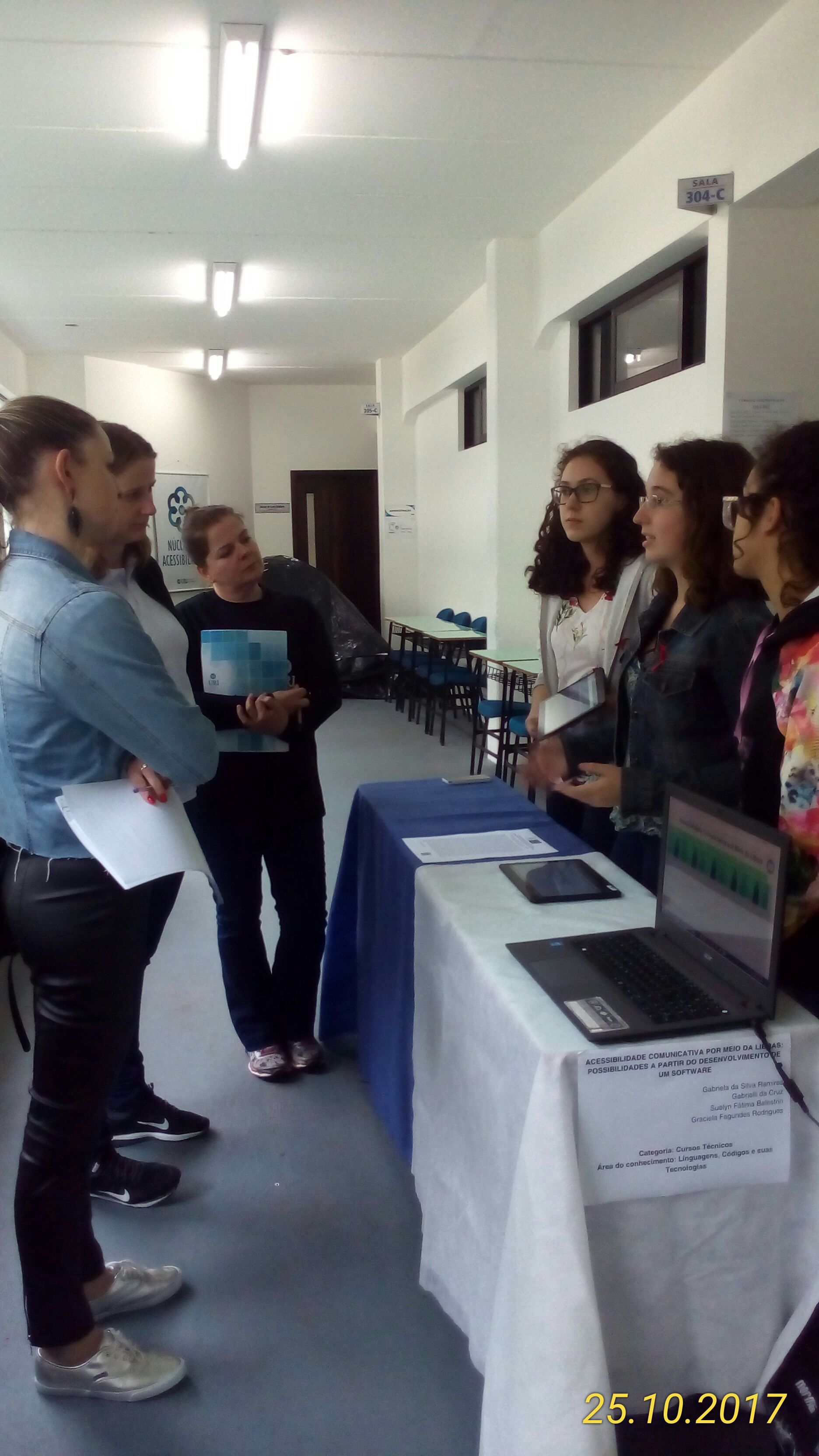 Acessibilidade comunicativa por meio da Libras: possibilidades a partir do desenvolvimento de um software, das alunas Gabriela da Silva Ramires, Gabrielli da Cruz e Suelyn Fátima Balestrin do 1º ano do Curso, com orientação da Profa. Graciela Fagundes Rodrigues.