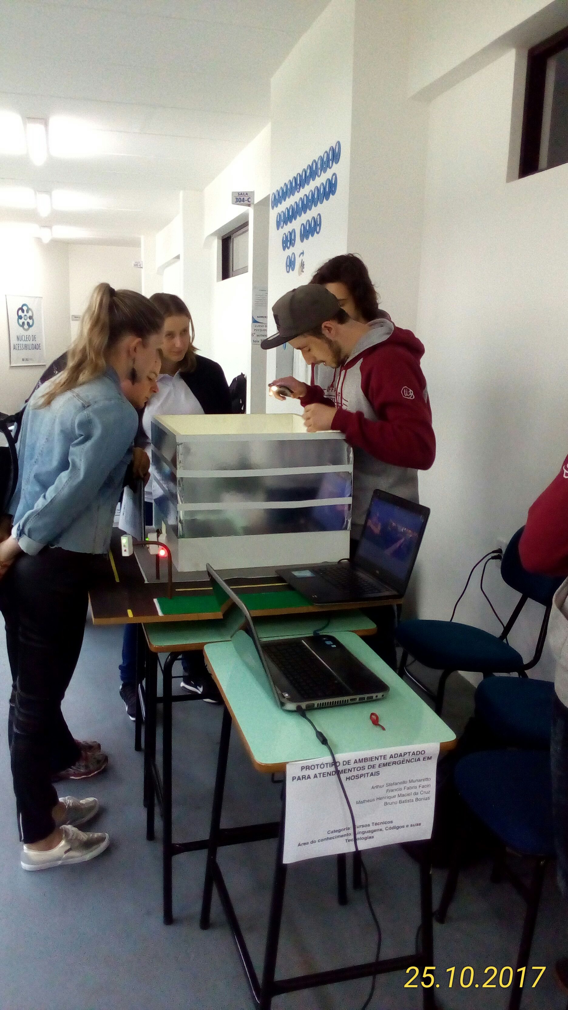 Protótipo de ambiente adaptado para atendimentos de emergência em hospitais, dos alunos Arthur Stefanello Munaretto, Francis Fabris Facin e Matheus Henrique Maciel da Cruz do 3º ano do Curso, sob orientação do Prof. Bruno Batista Boniati.