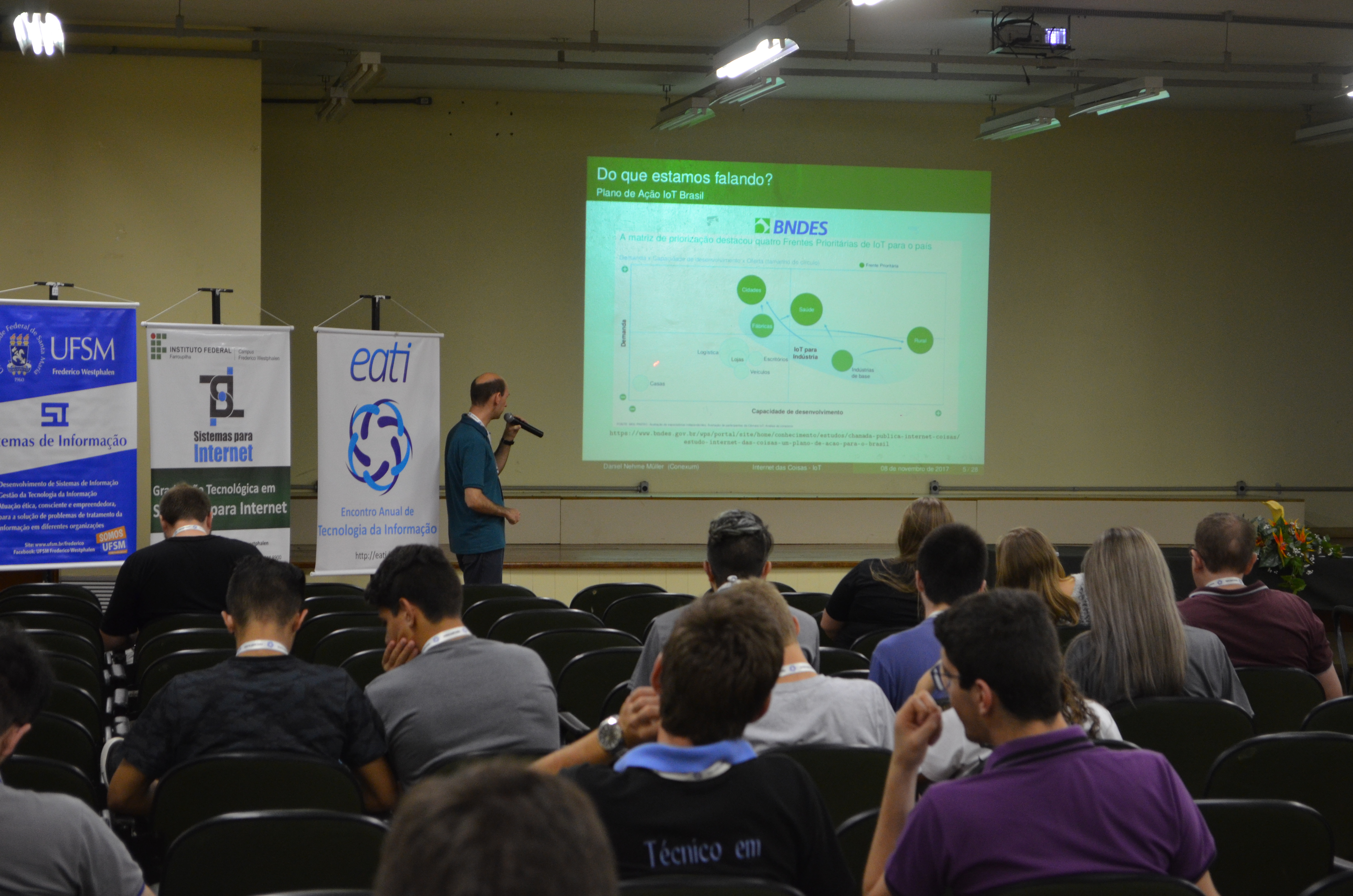 Esta semana é marcada pela 8º edição do EATI - Encontro Anual de Tecnologia da Informação, que é organizado pelos cursos da área de Tecnologia da Informação do Instituto Federal Farroupilha Campus Frederico Westphalen e da Universidade Federal de Santa Maria Campus Frederico Westphalen. O 8º EATI tem como foco os temas atuais da área da Tecnologia da Informação e além das palestras ocorreram apresentações de trabalhos nas categorias, plenária, que são as apresentações orais e na categoria de pôster.