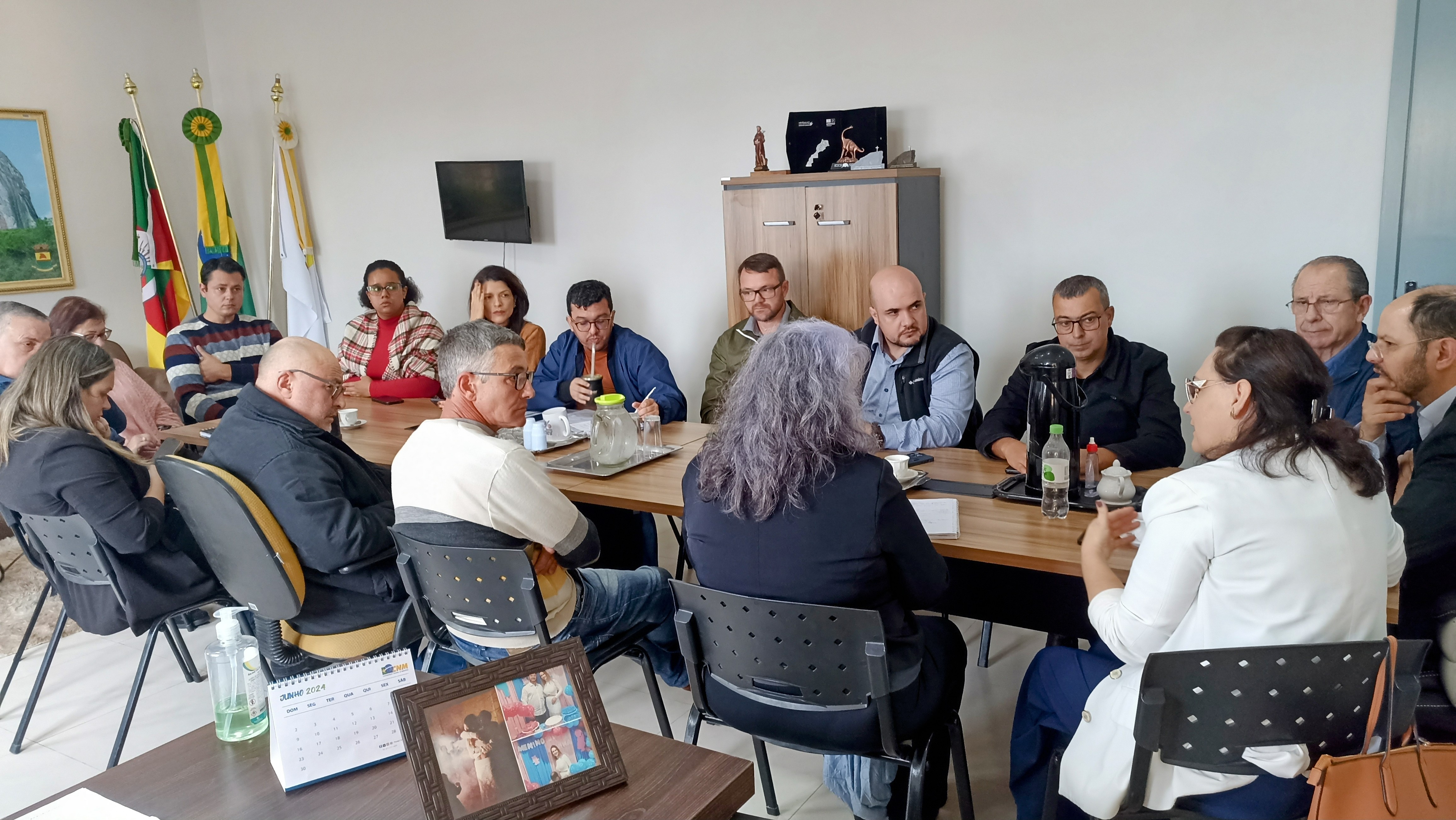 Foto: Participaram da reunião a reitora do IFFar, professora Nídia Heringer; o prefeito de Caçapava do Sul, Giovani Amestoy; o vice-prefeito de Caçapava do Sul, Luiz Carlos Guglielmin; o prefeito de Santana da Boa Vista, Garleno Alves da Silva; o vereador de Caçapava do Sul, Boca; o vereador de Santana da Boa Vista, Cristian dos Santos; a secretária de Educação de Caçapava do Sul, Gislaine Huerta; a secretária de Planejamento e Meio Ambiente de Caçapava do Sul, Cássia Freitas; o procurador de Caçapava do Sul, Benhur Machado; o coordenador pedagógico de educação, professor Edimar Fonseca; o professor da rede estadual de ensino, Norton Ferreira; o presidente da Associação Comercial e Industrial de Caçapava do Sul, Eraldo Souza; a chefe do gabinete da reitora do IFFar, Dalva Pillar; o pró-reitor de Desenvolvimento Institucional do IFFar, Carlos Lehn; o diretor de Planejamento e Desenvolvimento Institucional, Gabriel Garcia; e os servidores(as) do IFFar Kauana Amaral, Anelise Cruz e Alberto Galli/ARP.