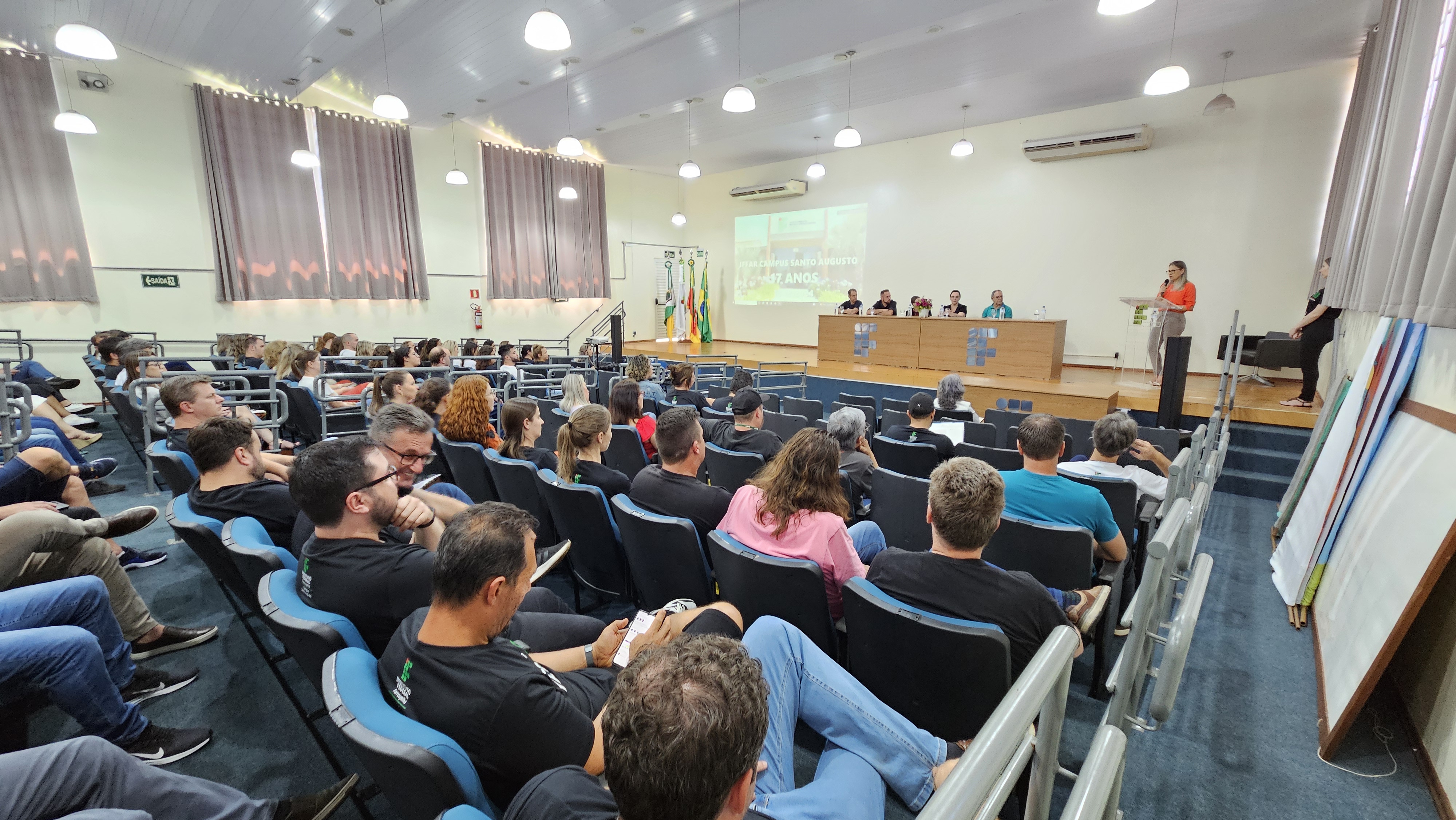 A programação começou às 13h45 com uma apresentação de fatos históricos e a exibição de um vídeo comemorativo aos 17 anos do campus, destacando momentos marcantes de alunos e servidores. Em seguida, a mesa oficial foi formada para os pronunciamentos das autoridades. A reitora Nídia Heringer enfatizou a importância do campus para a expansão da educação profissional e tecnológica, não só para o município de Santo Augusto, mas para toda a região, destacando o ensino público, gratuito e de qualidade.