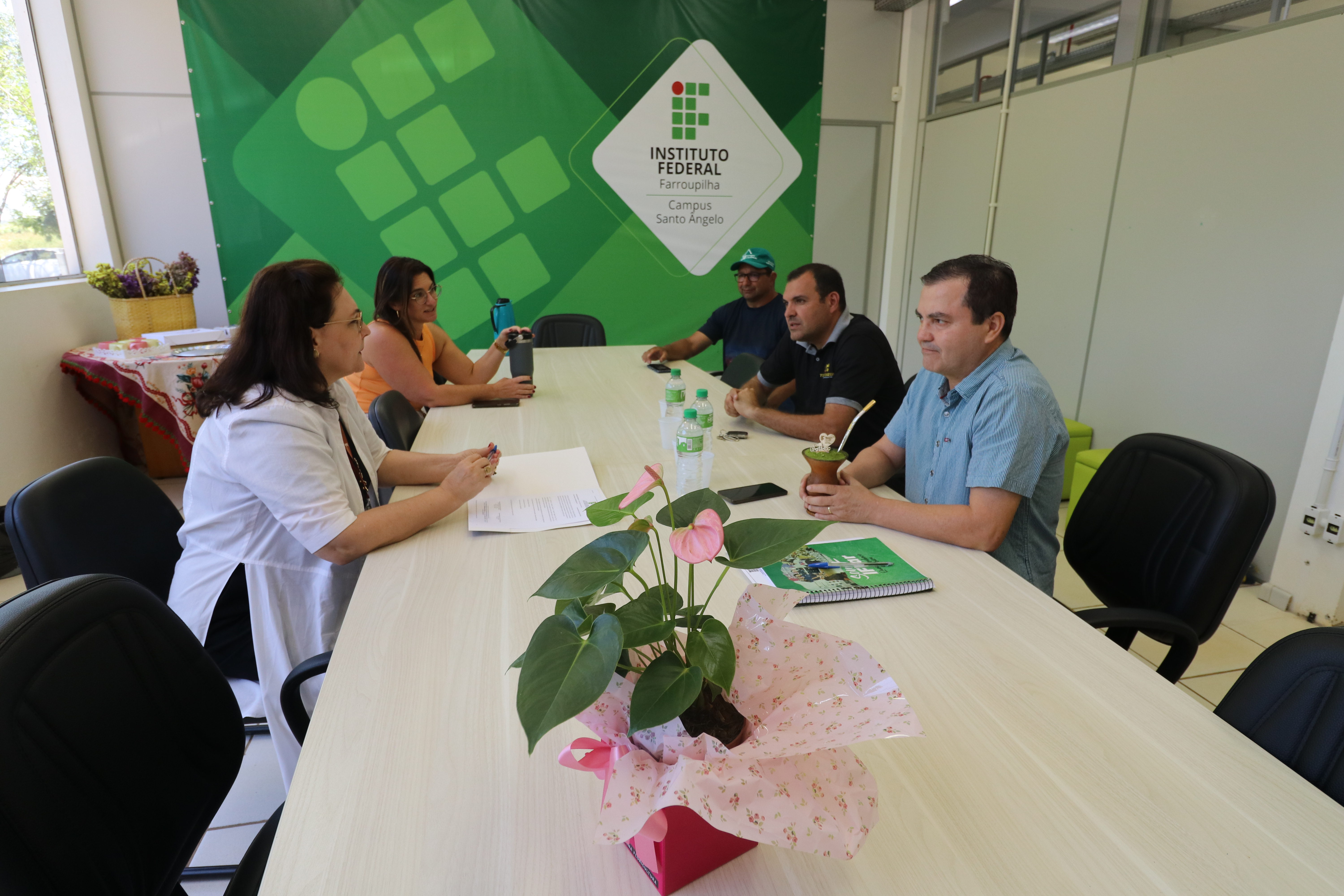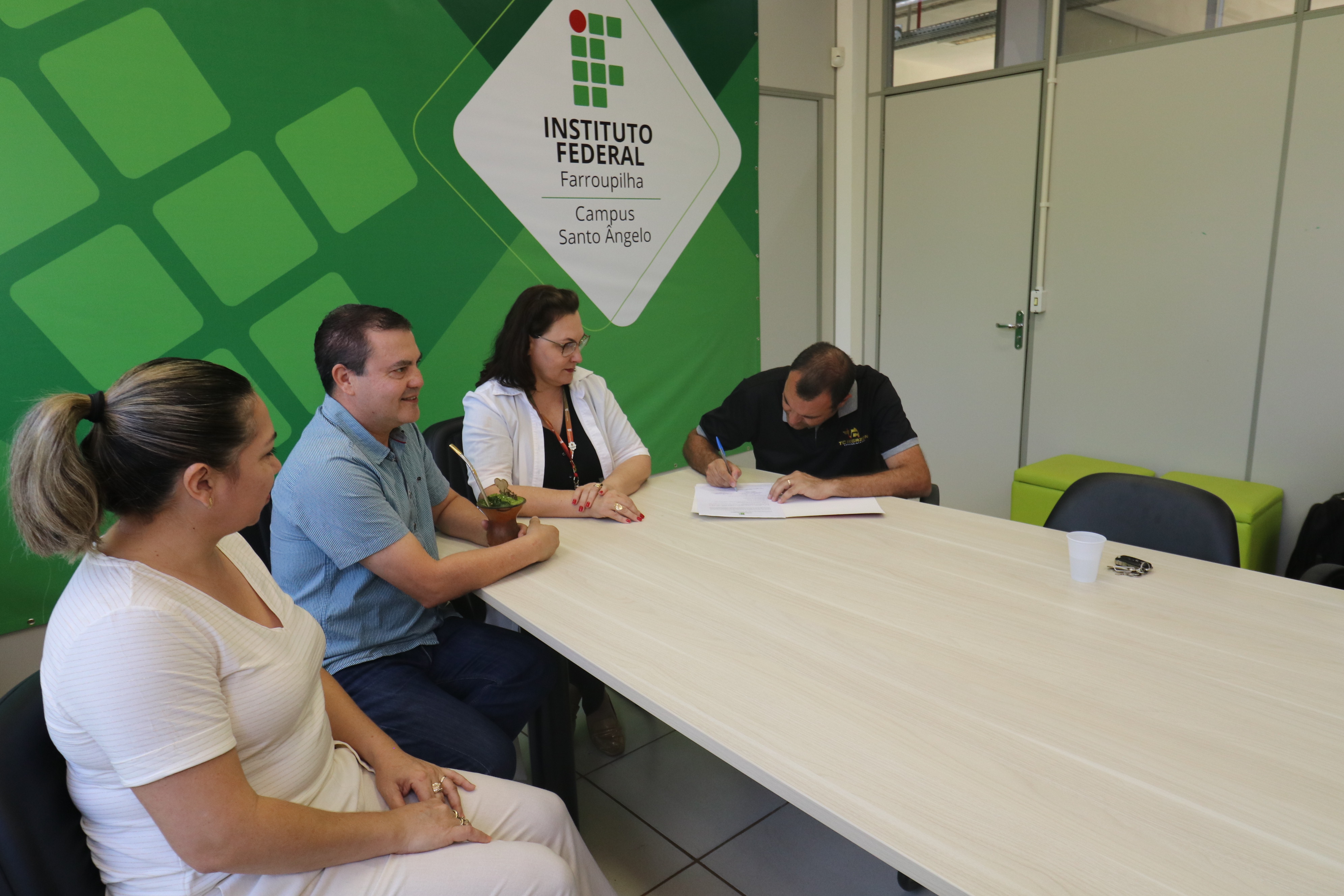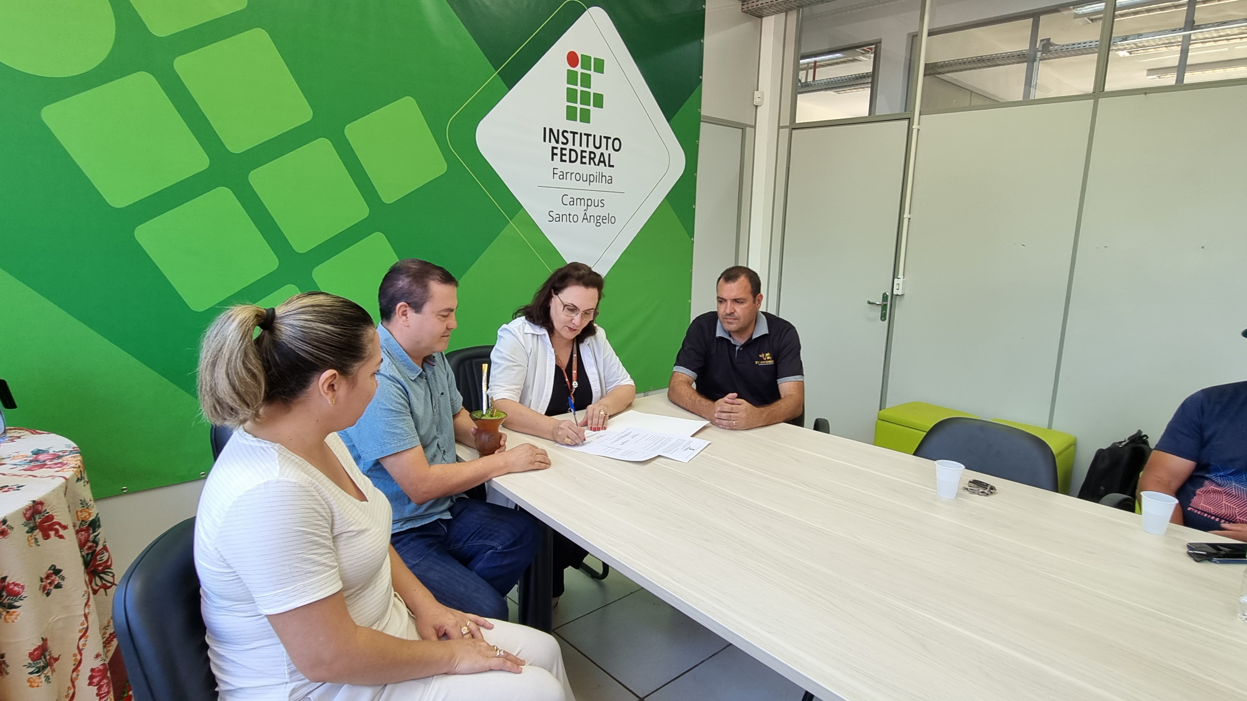 A cerimônia no campus Santo Ângelo contou com a presença da reitora, do diretor-geral do campus, da diretora-geral eleita e do representante da empresa vencedora do processo licitatório. Foto: ASCOM/ IFFar Santo Ângelo