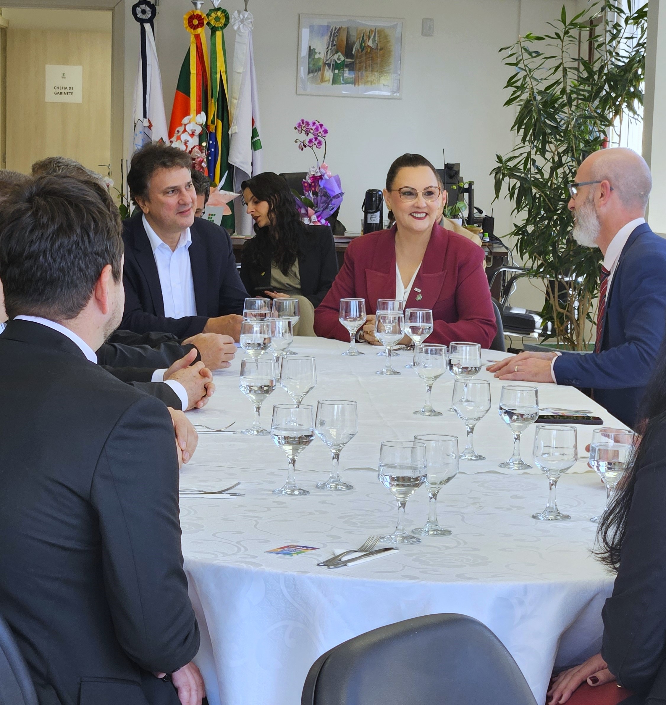 Nesta quinta-feira (21), a reitora do IFFar, professora Nídia Heringer, recebeu em seu gabinete o ministro da Educação, Camilo Santana. O ministro esteve em Santa Maria para a cerimônia que marcou a recondução da reitora ao cargo para a gestão 2025-2029. O evento, realizado no Salão Nobre do Avenida Tênis Clube, reuniu autoridades, servidores e cerca de 400 estudantes de todos os campi do IFFar.