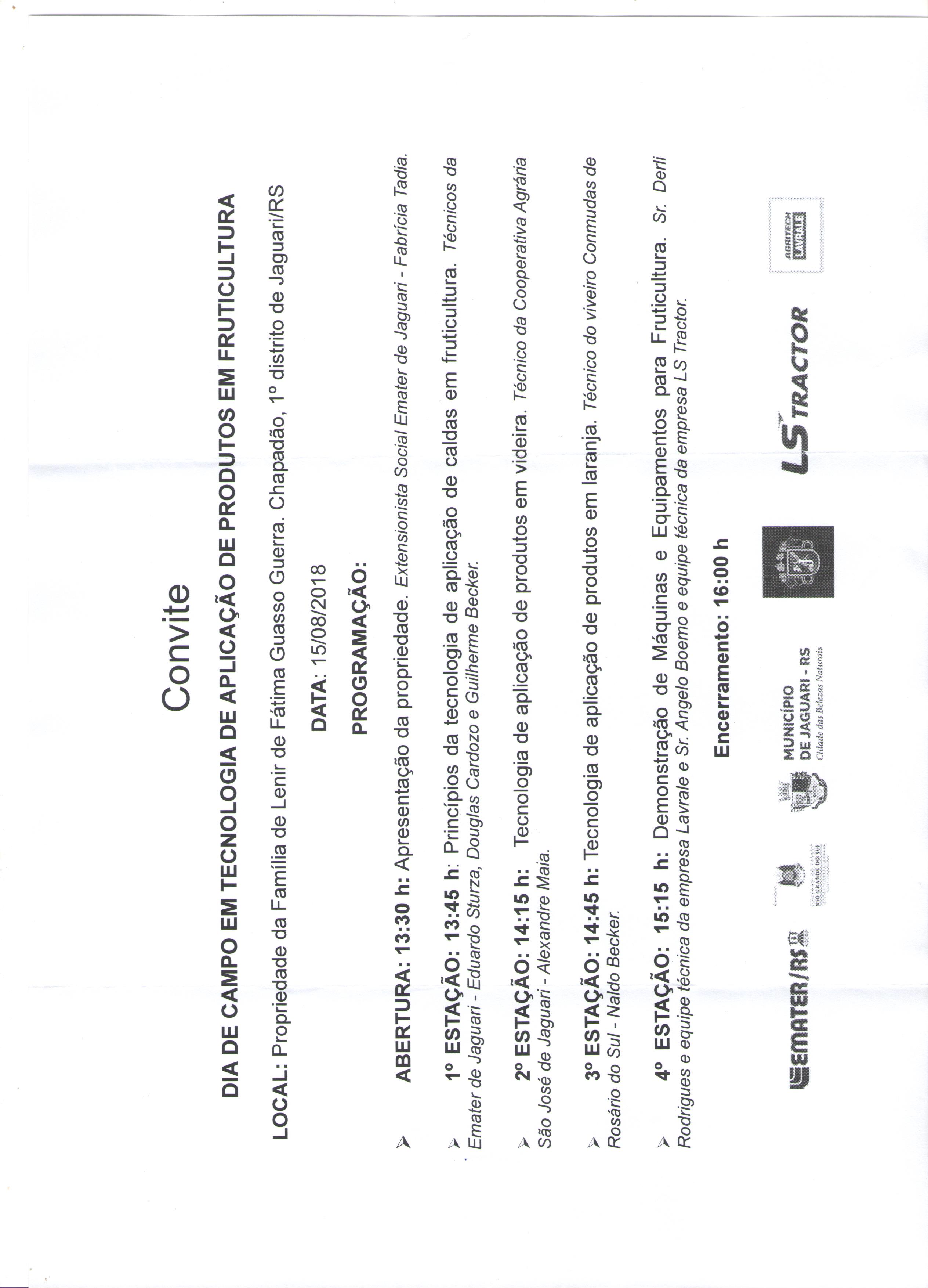 A Emater, com o apoio da Administração Municipal de Jaguari e outras entidades, está realizando um dia de campo em tecnologia de aplicação de produtos em fruticultura. O evento será realizado no dia 15 de agosto, a partir das 13h30min, na propriedade da família Lenir de Fátima Guasso Guerra, na localidade do Chapadão, em Jaguari. Anexo o cronograma completo do evento.