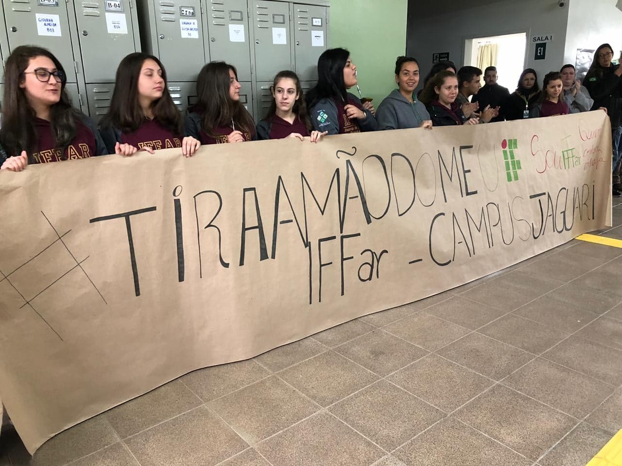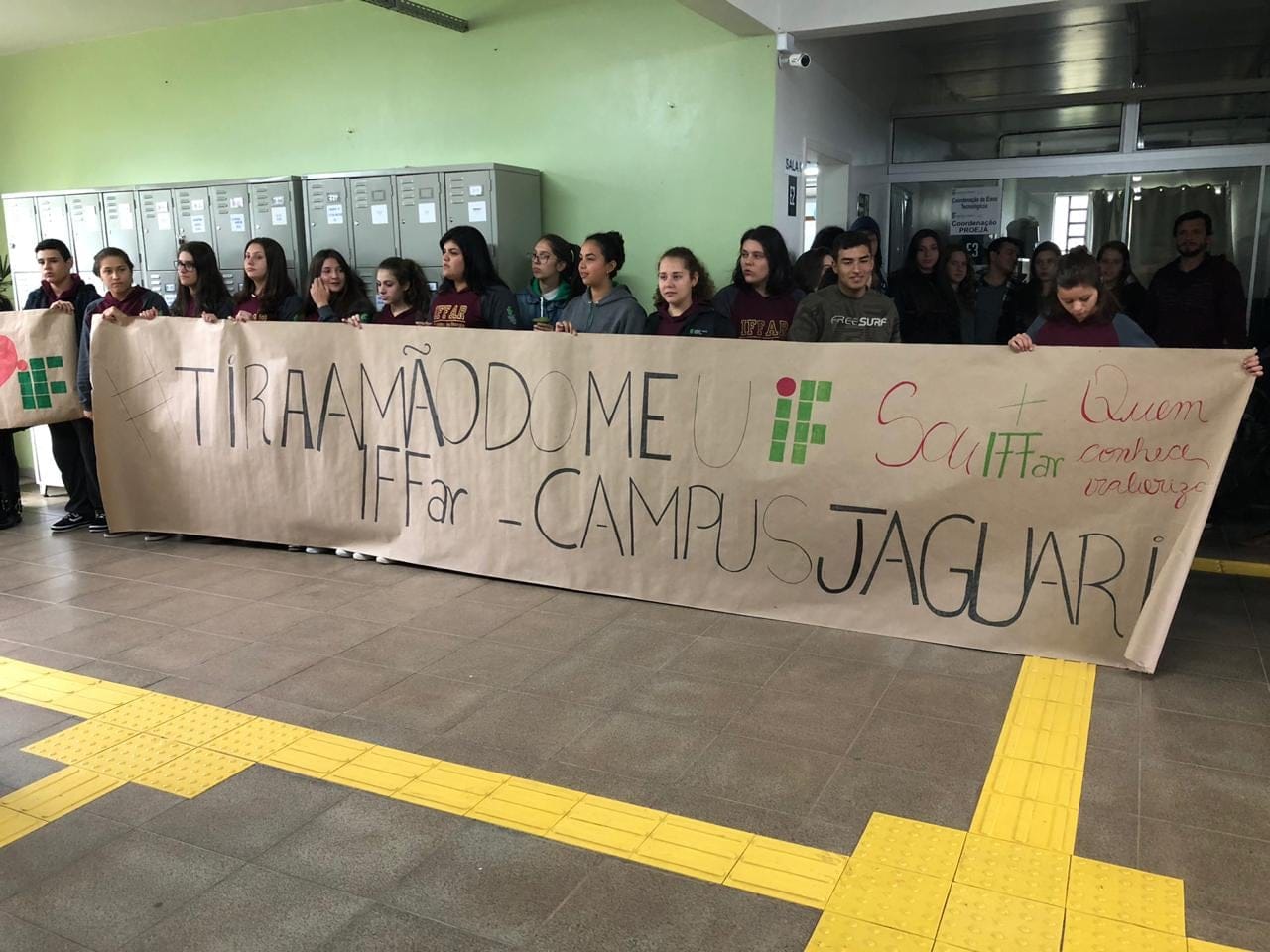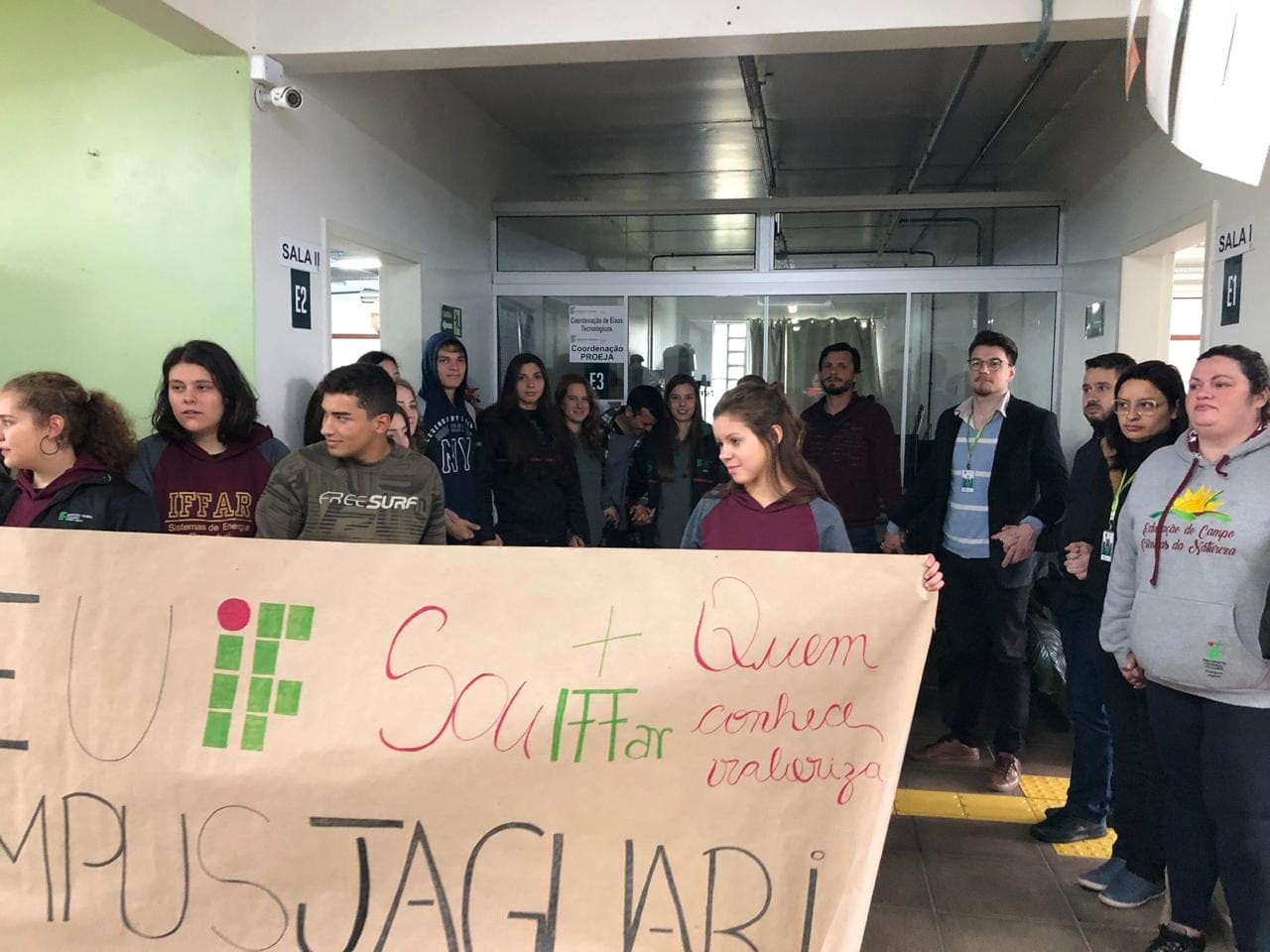 Na tarde desta segunda-feira, alunos e servidores do IFFar - Campus Jaguari promoveram um abraço simbólico à instituição. O Diretor Geral, Carlos Roberto Devincenzi Socal, contextualizou o ato, asseverando que é preciso garantir a educação pública gratuita e de qualidade no Brasil. Foi lida a Nota Oficial do Conif. Essa atividade integra um movimento nacional sincronizado em todas as unidades dos Institutos Federais do país.