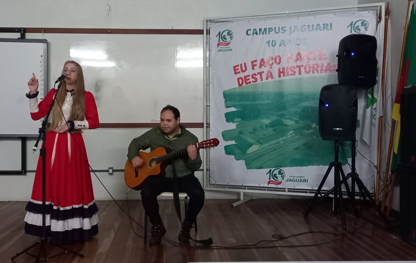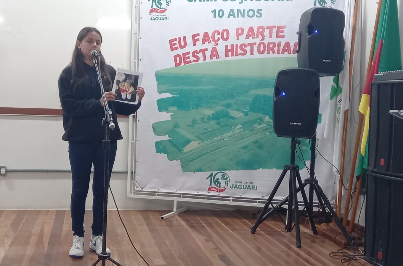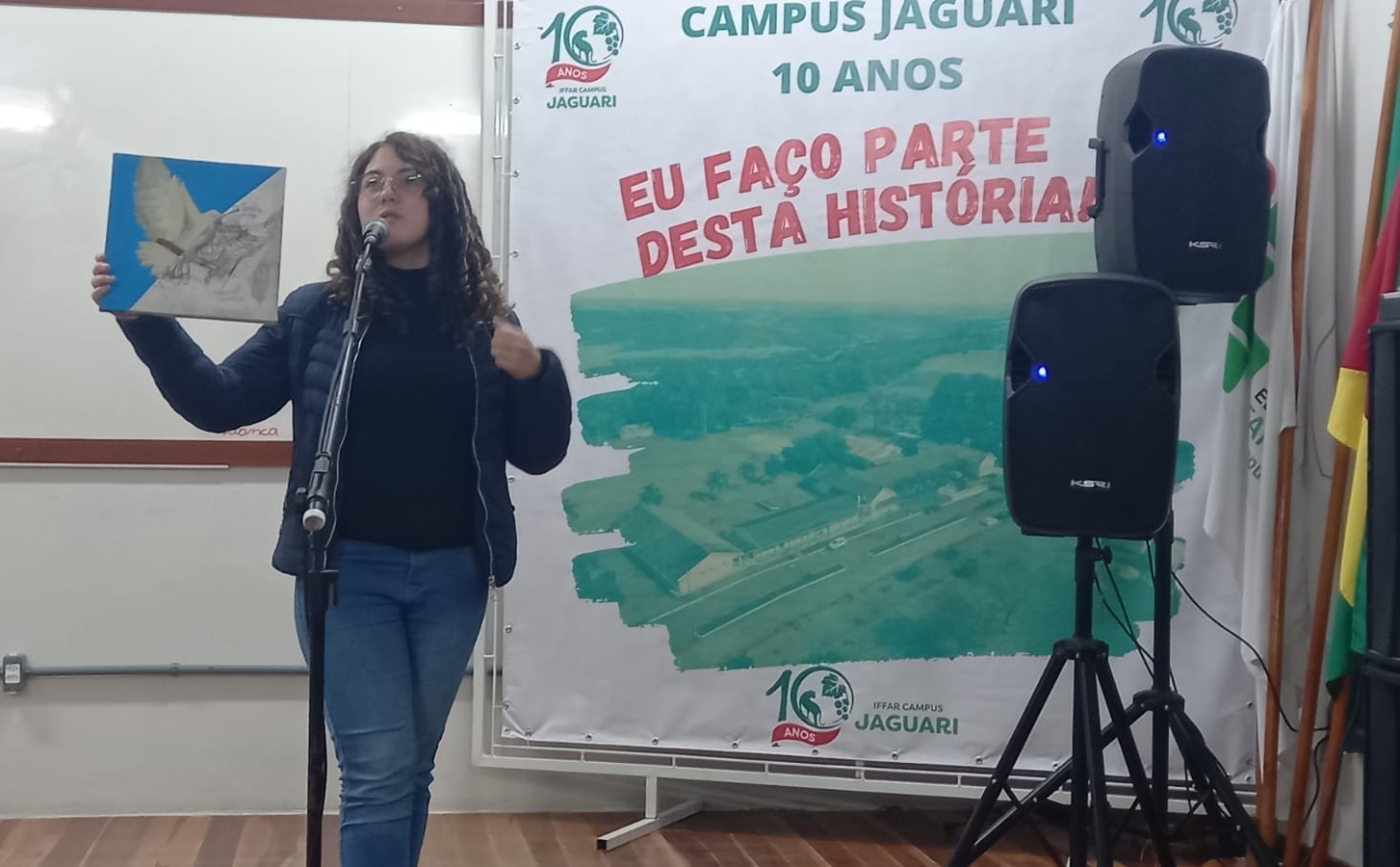 Aconteceu no dia 04 de outubro a Mostra Cultural etapa interna, com o objetivo de socializar e apresentar à comunidade diversas formas de expressão artístico-cultural presentes no Campus, os representantes classificados representarão o Campus Jaguari na 11ª Edição da Mostra Cultural 2023 do IFFar. Nesta 11º edição o evento acontece no final do mês de outubro nos dias 26 e 27, no Campus São Vicente do Sul. Ressaltamos que as obras deste ano trazem como temática: "Agenda 2030 - Objetivo Desenvolvimento Sustentável - Nº 16 - Paz, Justiça e Instituições Eficazes". Seguem os estudantes que se classificaram e irão representar o Campus Jaguari:
