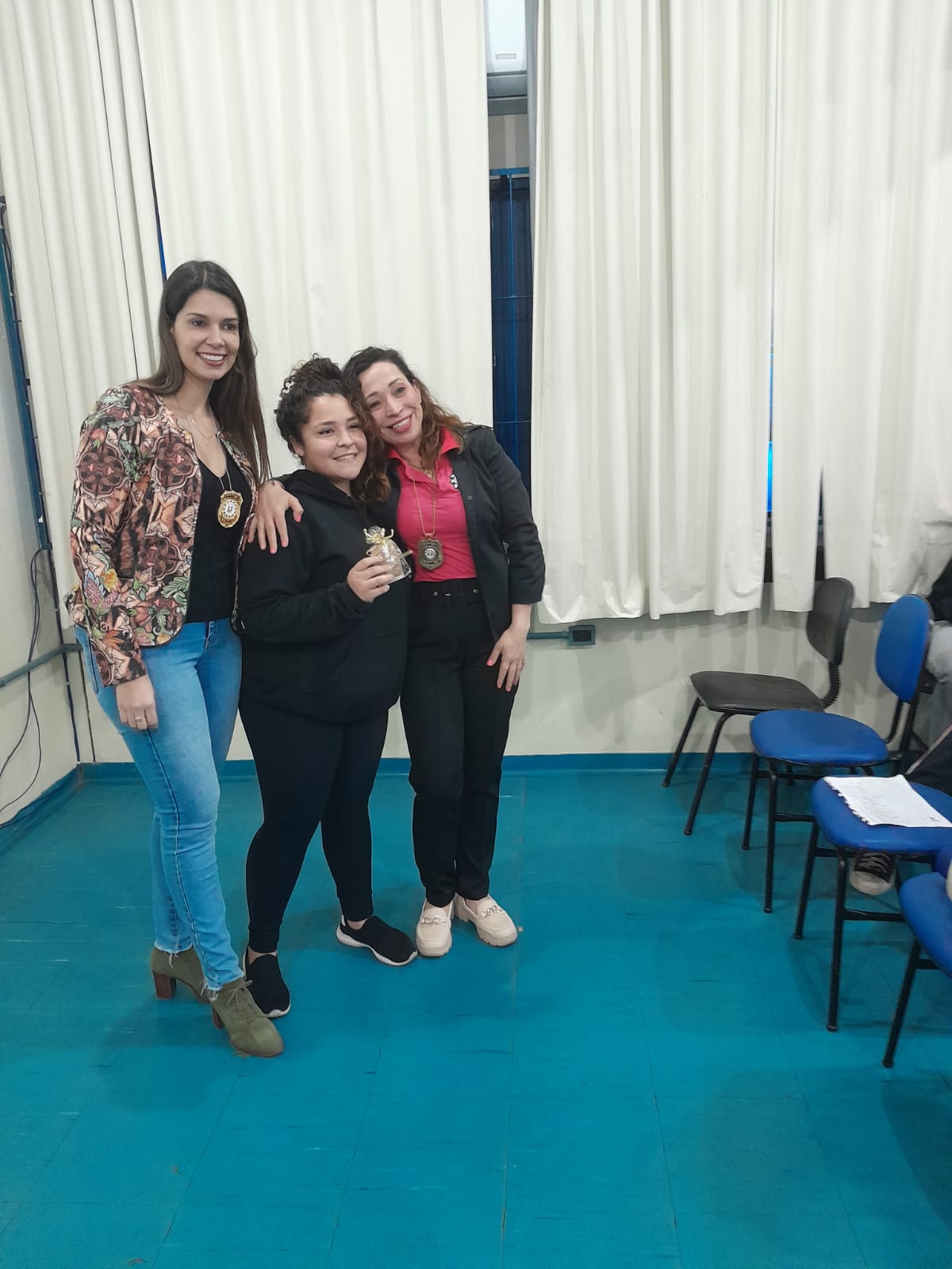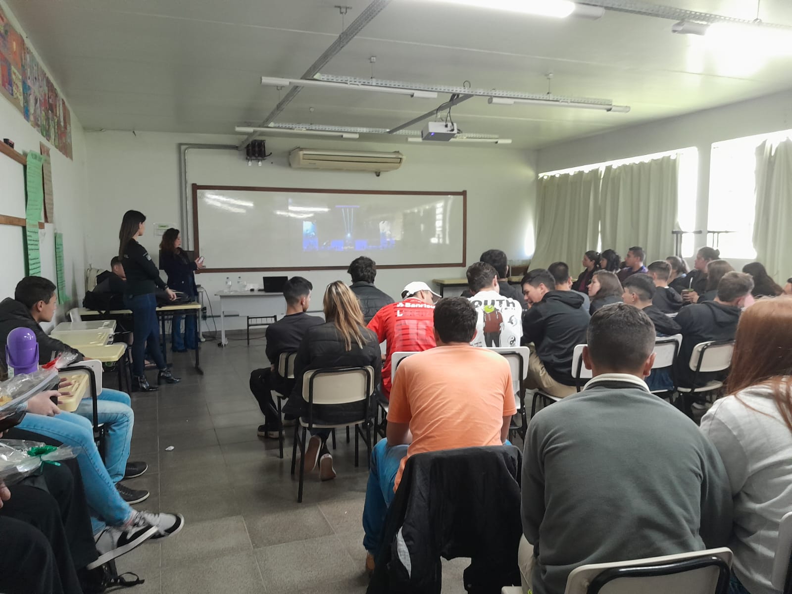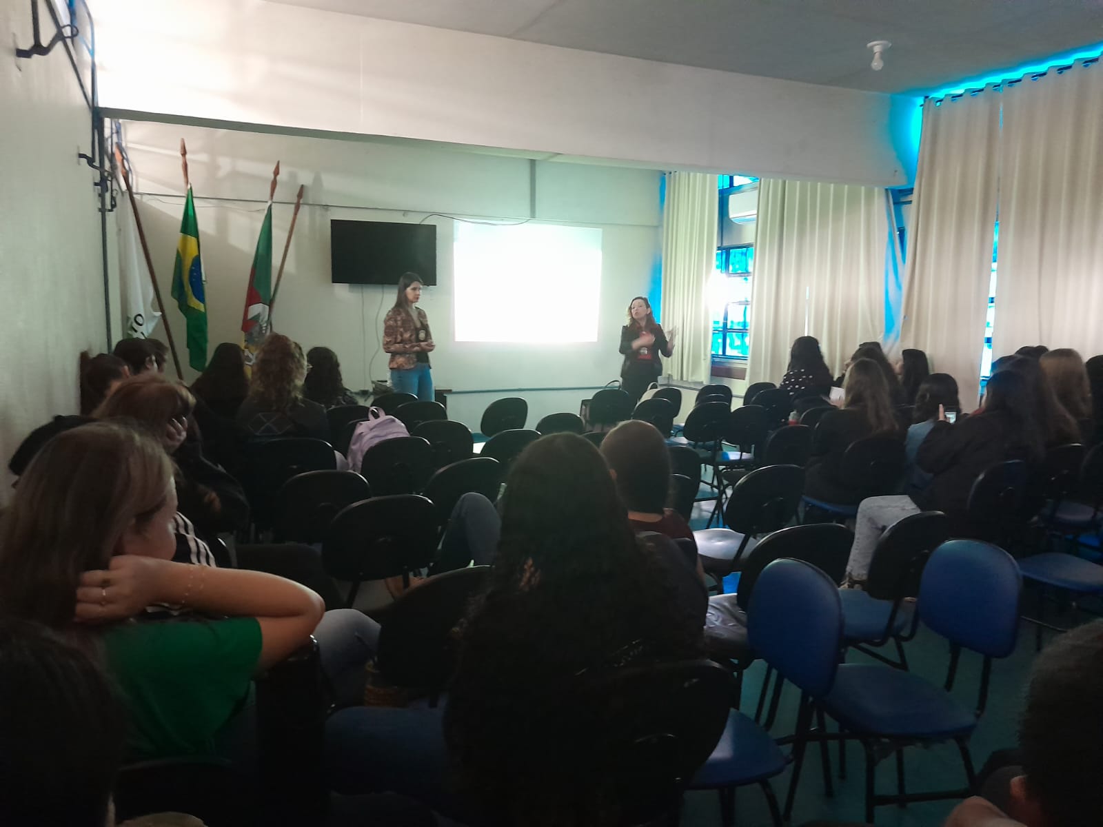 Através de uma ação promovida pela CAA e Nugedis, as agentes da Sala das Margaridas da Polícia Civil de Santiago Cíntia da Silva Moura e Suziane Aparecida de Lima estiveram no IFFar realizando atividades relativas à temática do Combate à Violência contra a Mulher. No dia 28 de setembro, a ação foi realizada com turmas dos cursos técnicos Integrados em Agricultura e Sistemas de Energia Renovável no Campus Jaguari e, no dia 04 de outubro, com as turmas do Curso Técnico Integrado em Administração no Centro de Referência, em Santiago.