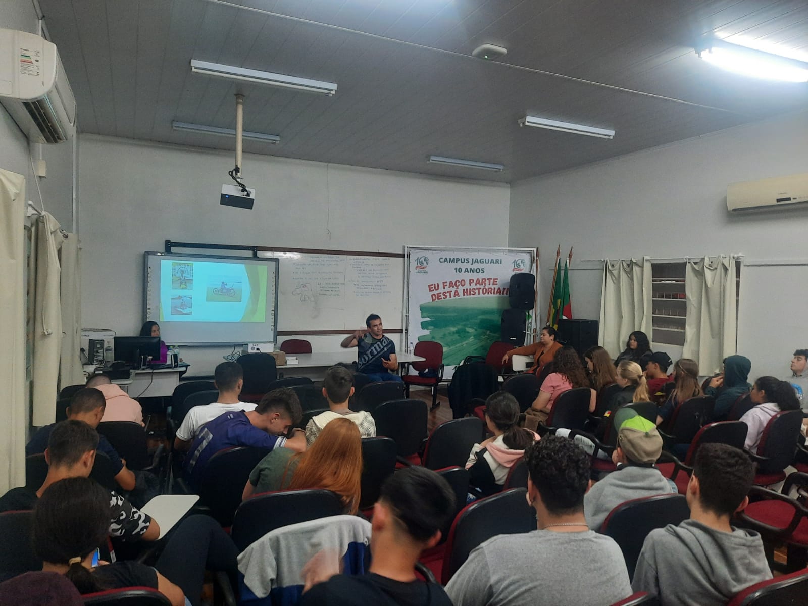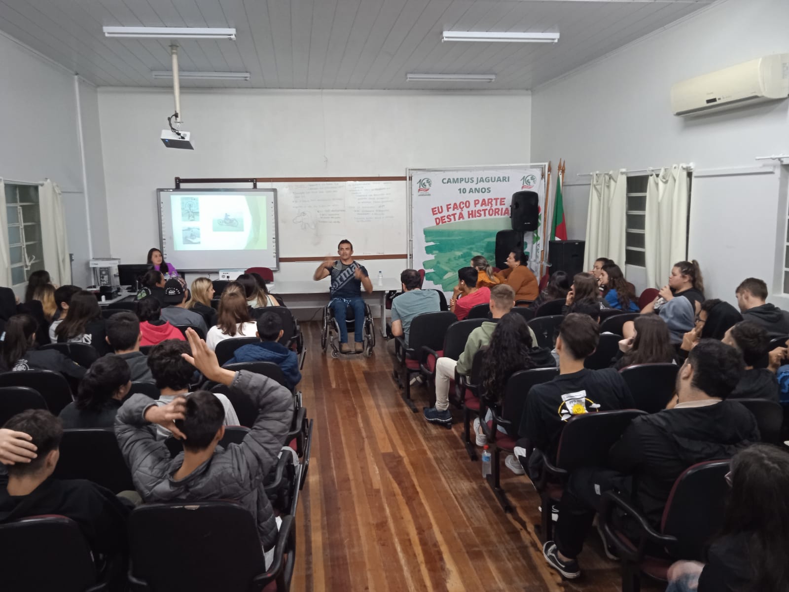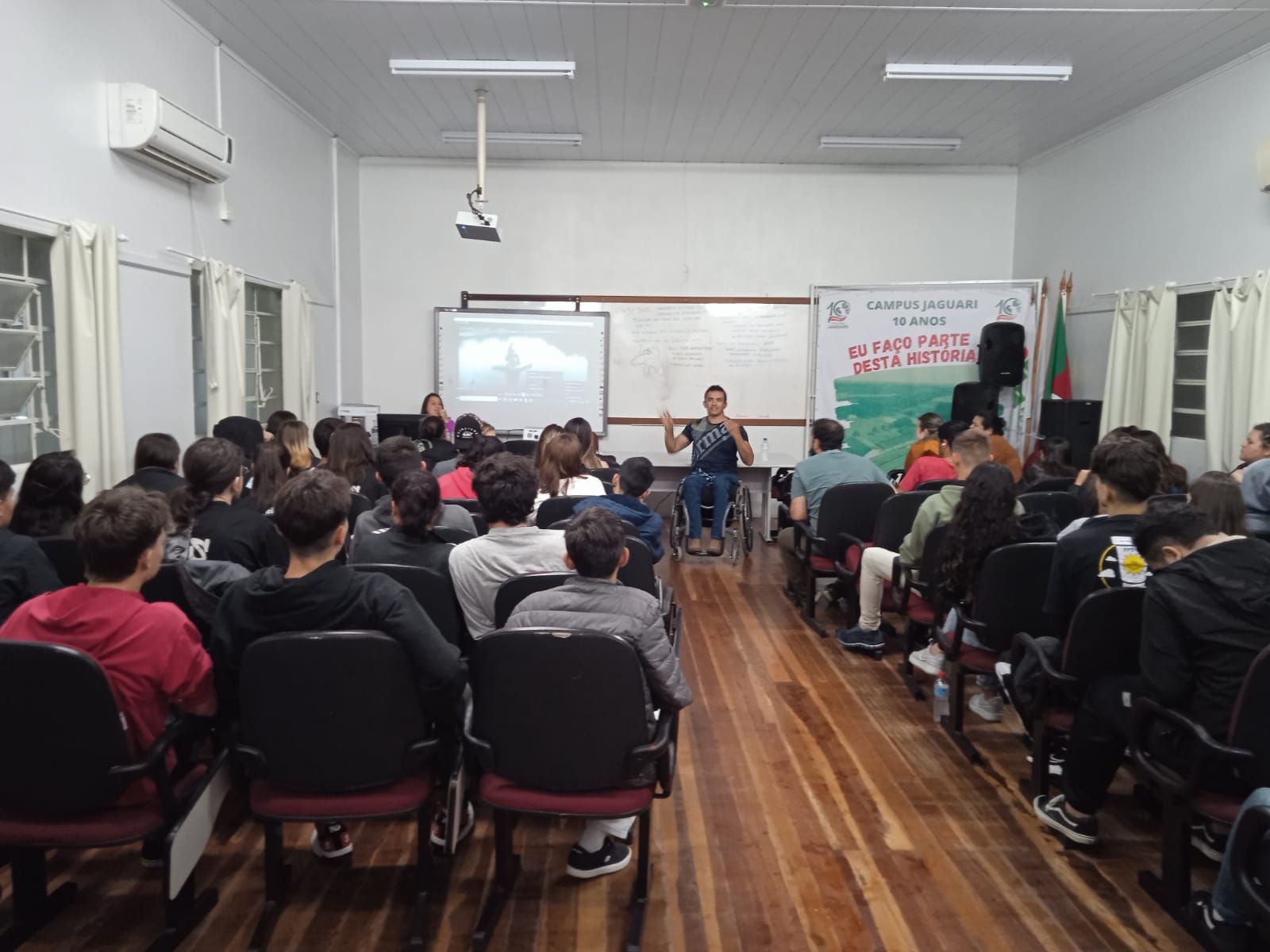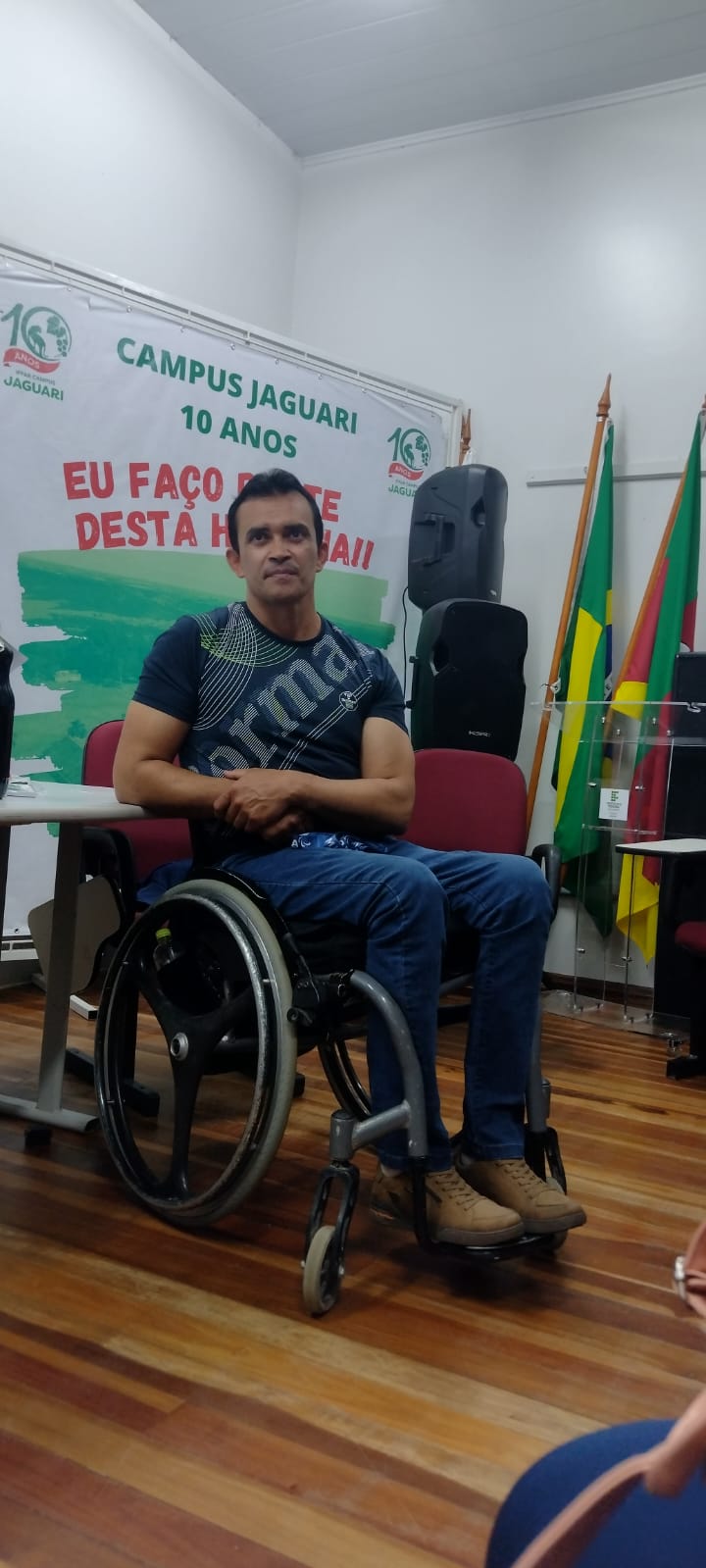No dia 16 de outubro de 2023 o Campus Jaguari recebeu o Presidente Associação Santa-mariense Paradesportiva Denilson Souza que realizou uma fala aos estudantes dos cursos integrados e PROEJA, sobre a importância da Superação sem Limites e da sustentabilidade como auxílio aos paratletas. Segundo Denilson uma mensagem que impactou sua vida e gostaria de deixar aos estudantes é de que "Dificuldades preparam pessoas comuns para destinos extraordinários" (C.S.Lewis) e gostaria de que o dia ficasse marcado como um momento de reflexão e troca de experiência para a vida dos estudantes. A professora Valesca Vargas Vieira promotora do evento destaca que o incentivo à campanha Paratletas, com a coleta de tampas plásticas, lacres e blísteres de medicamentos ajudam a construir um comportamento humano em compromisso com o meio ambiente.
