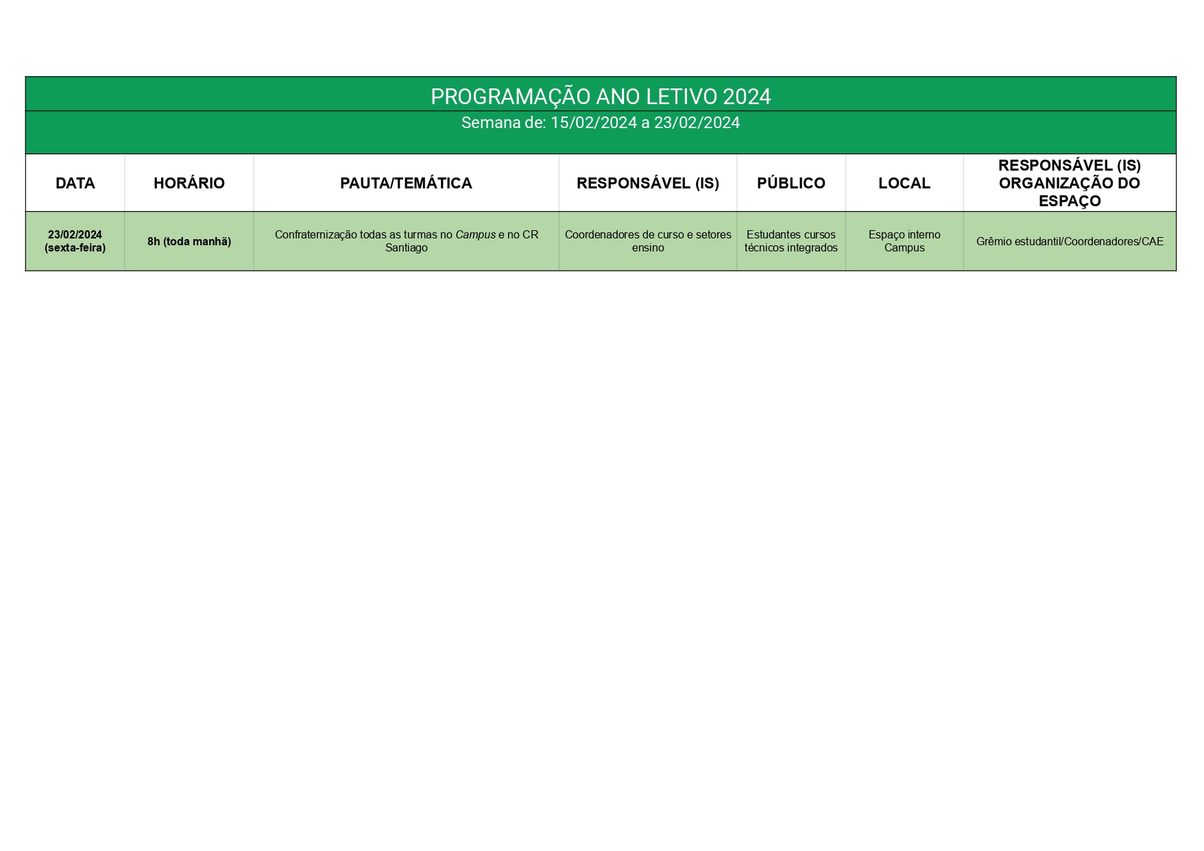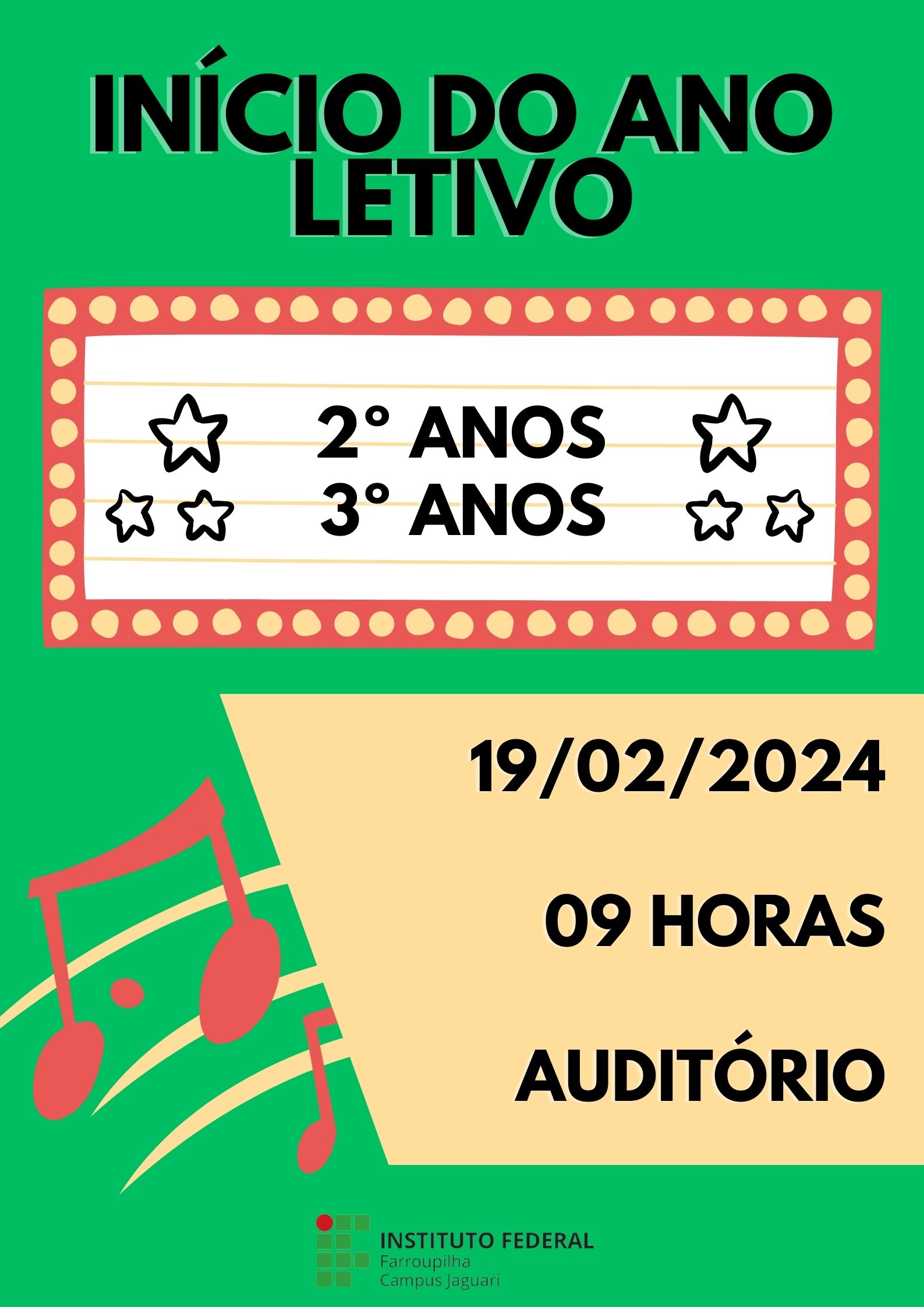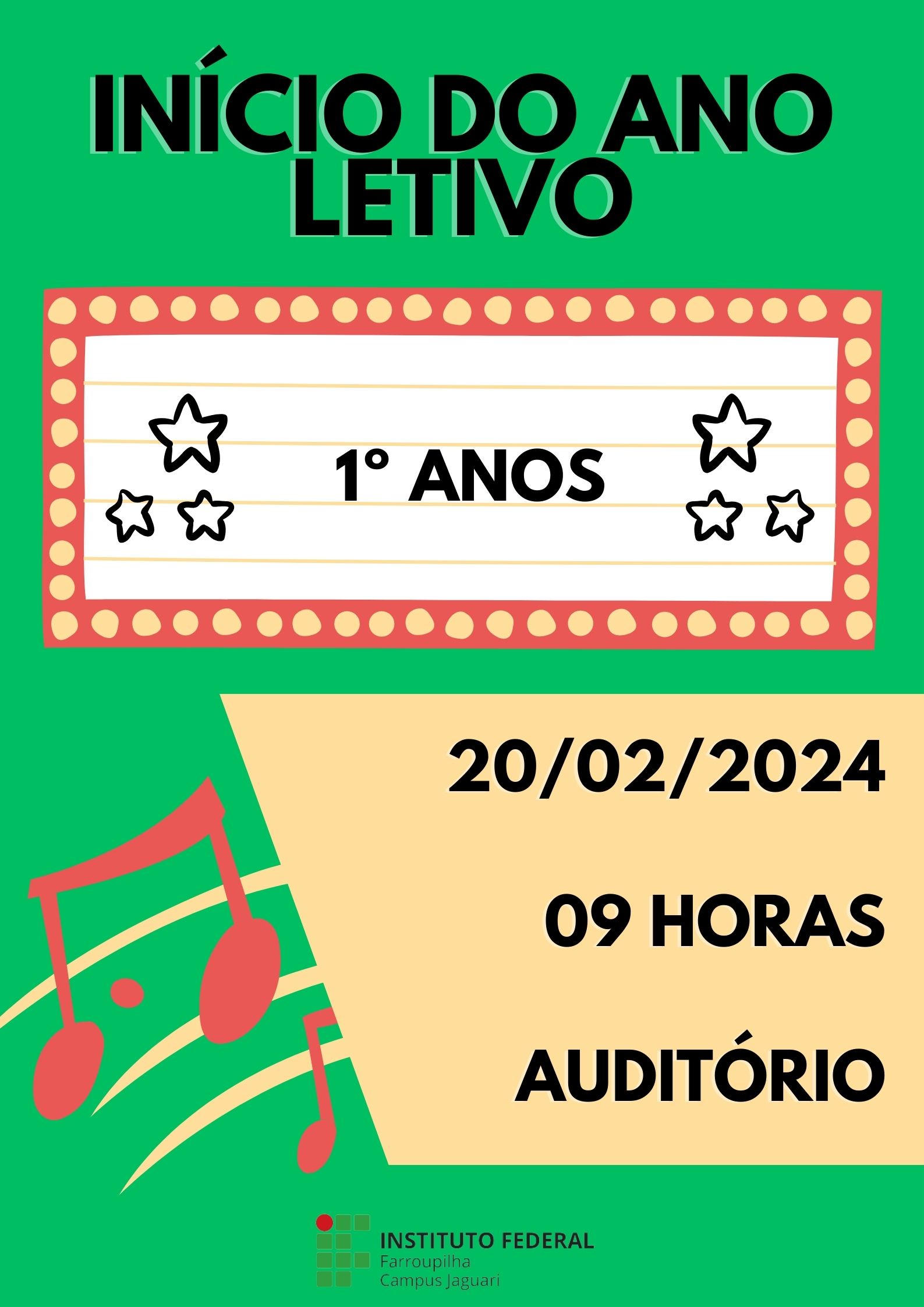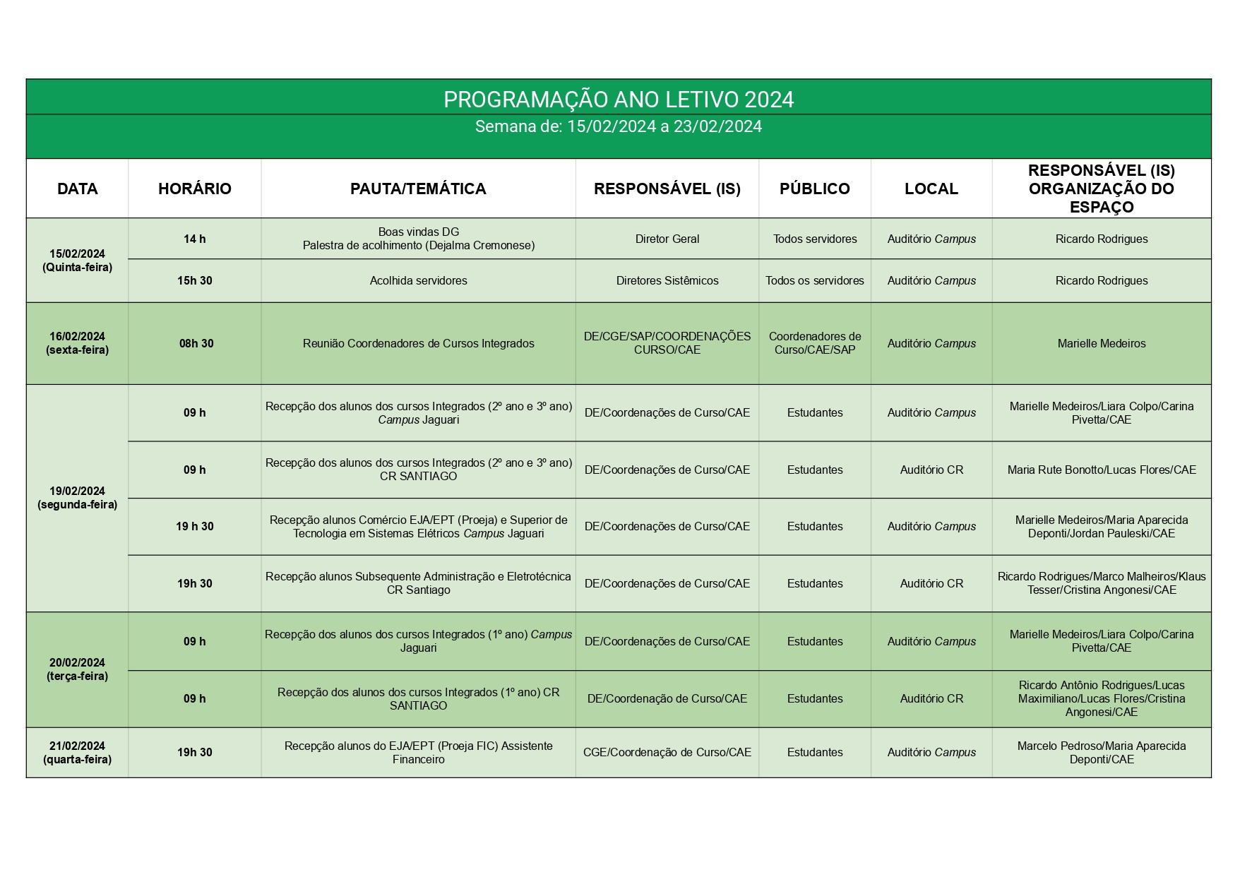 Nos dias 19 e 20 de fevereiro de 2024 o Campus Jaguari receberá os estudantes dos Cursos Integrados, EJA/EPT, Subsequentes e Superiores para início do ano letivo. Para os estudantes dos 1ºs anos destacamos a importância da presença de um responsável (devido espaço disponível) pelo discente, para receber as orientações da instituição.