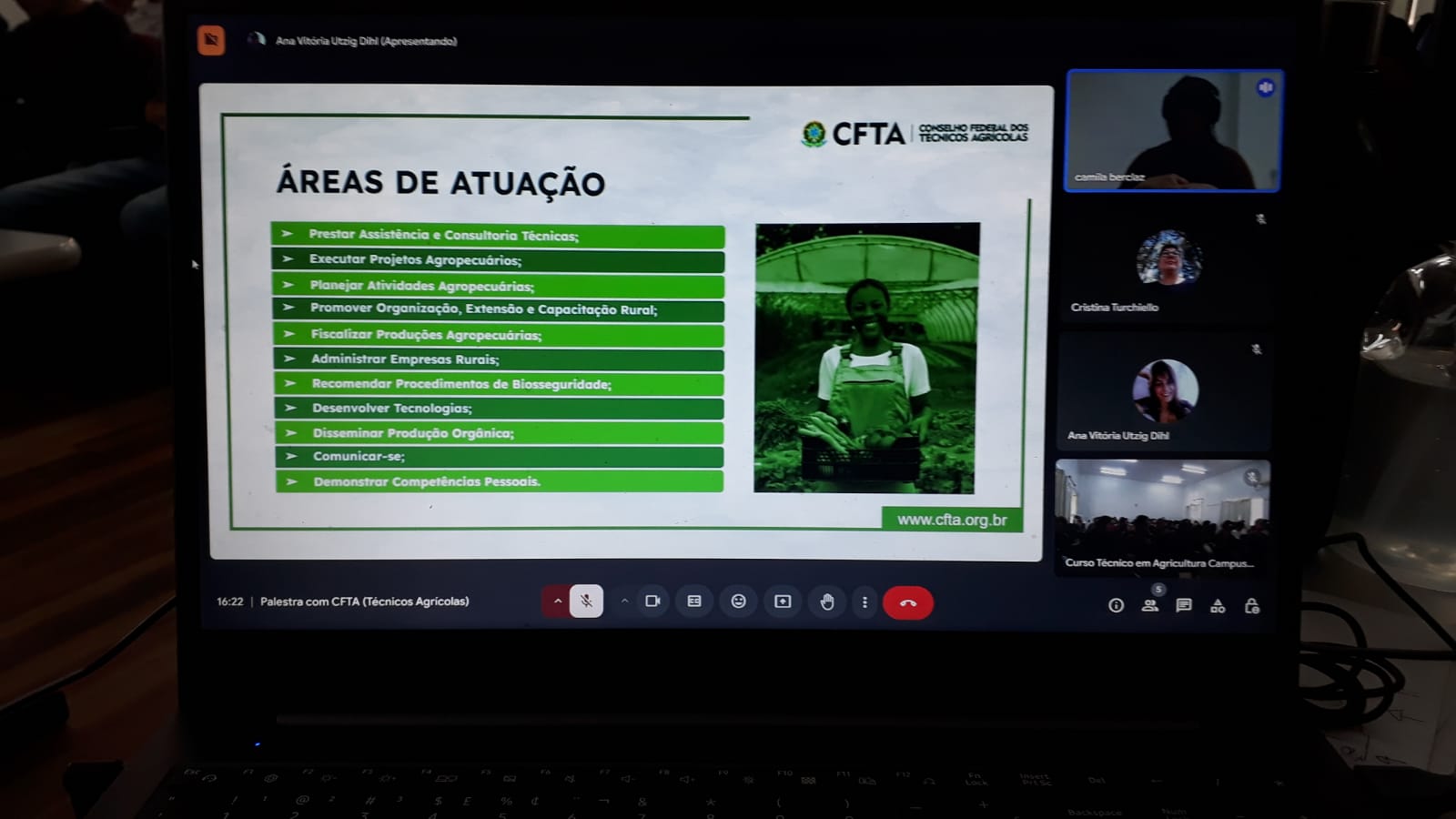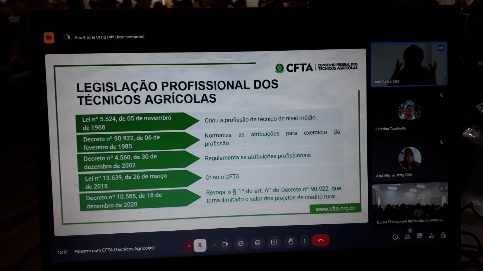 Estudantes do Curso Técnico em Agricultura Integrado do IFFar campus Jaguari, participaram em 12/11/24 de uma palestra com a assessora do Conselho Federal dos Técnicos Agrícolas (CFTA), Camila Berclaz. O encontro ocorreu de forma online e apresentou o conselho, sua estrutura, seu funcionamento, as formas de atuação e registro profissional do Técnico Agrícola em Agricultura. O CFTA existe há cerca de 6 anos e está trabalhando para agregar e auxiliar os técnicos agrícolas no âmbito de orientar, disciplinar e fiscalizar o exercício da profissão. Essa ação foi promovida pela disciplina de Orientação de Estágio ofertada para o 2º ano do curso e agregou também as turmas do 1º e 3º ano do curso Técnico em Agricultura Integrado.