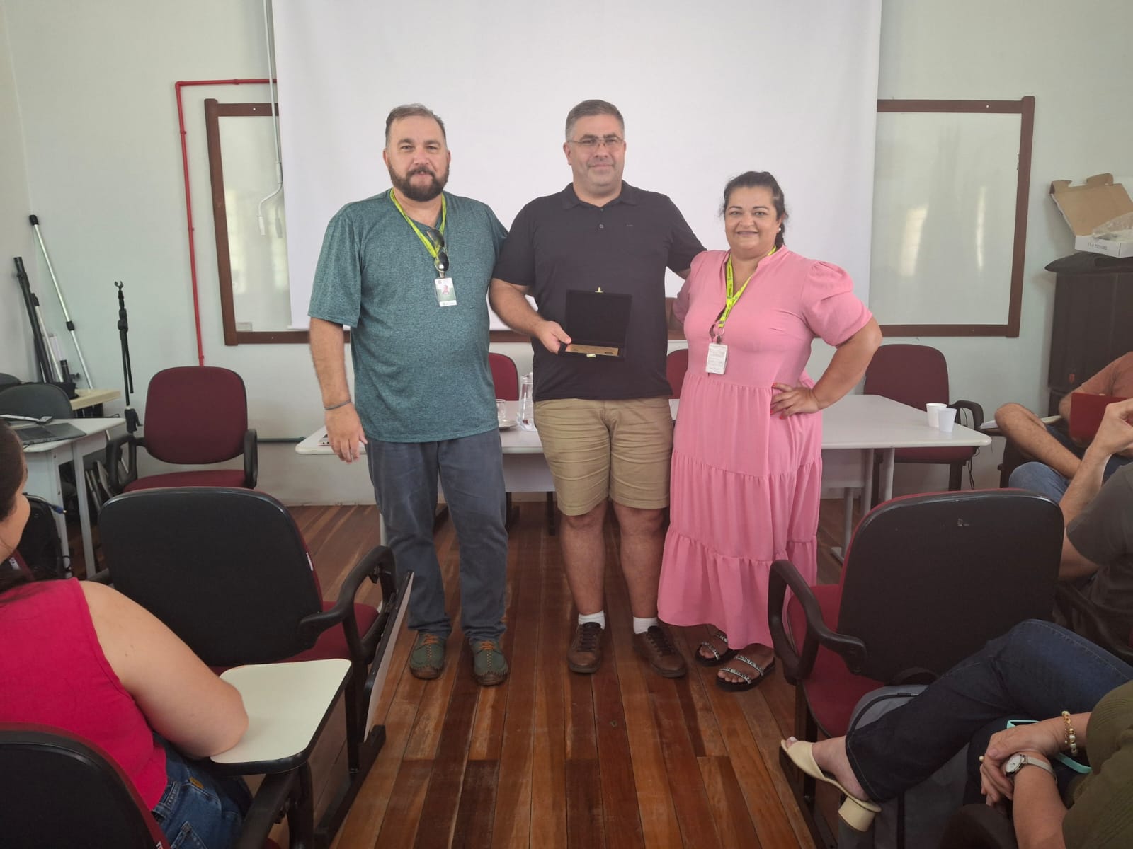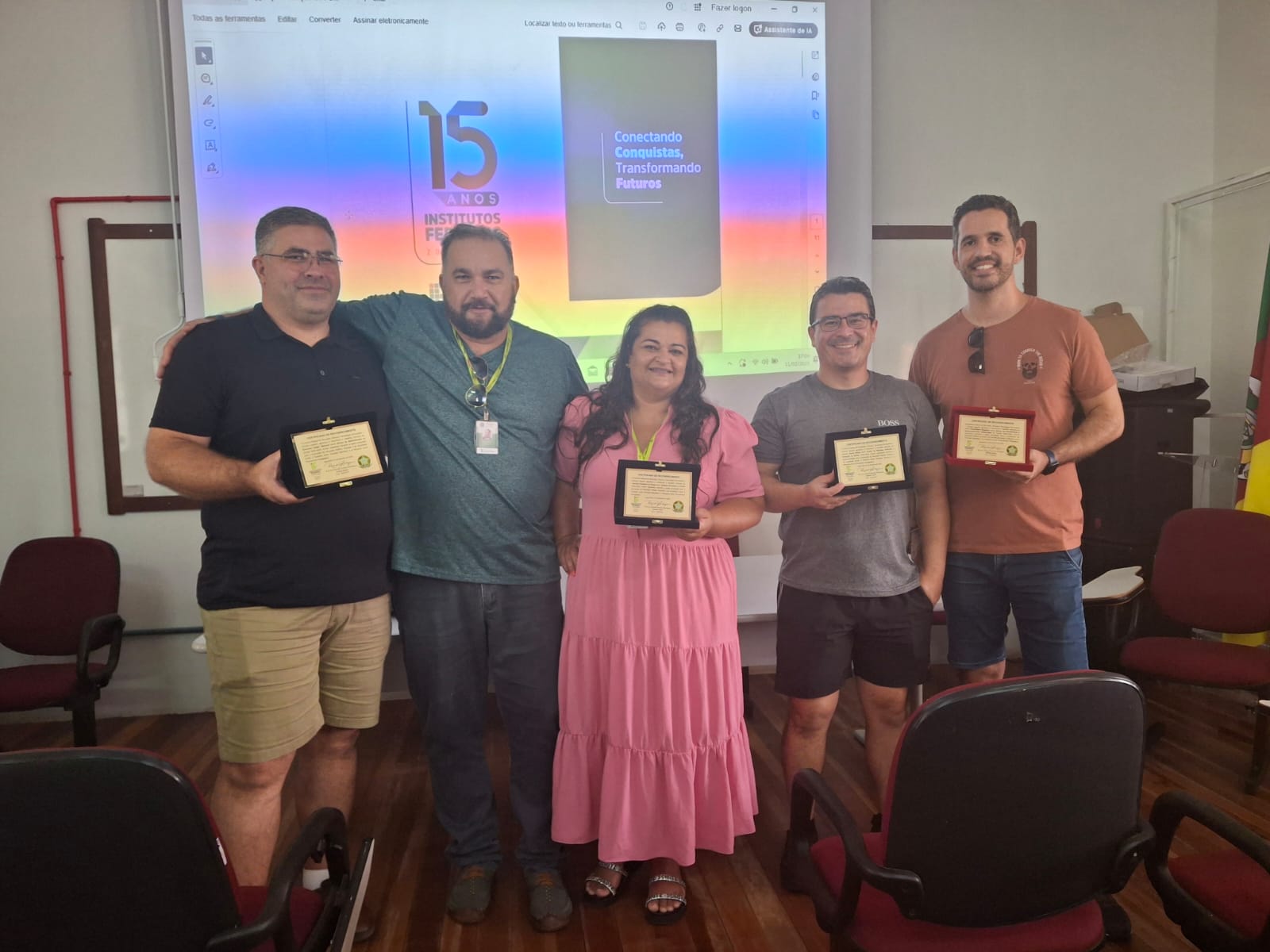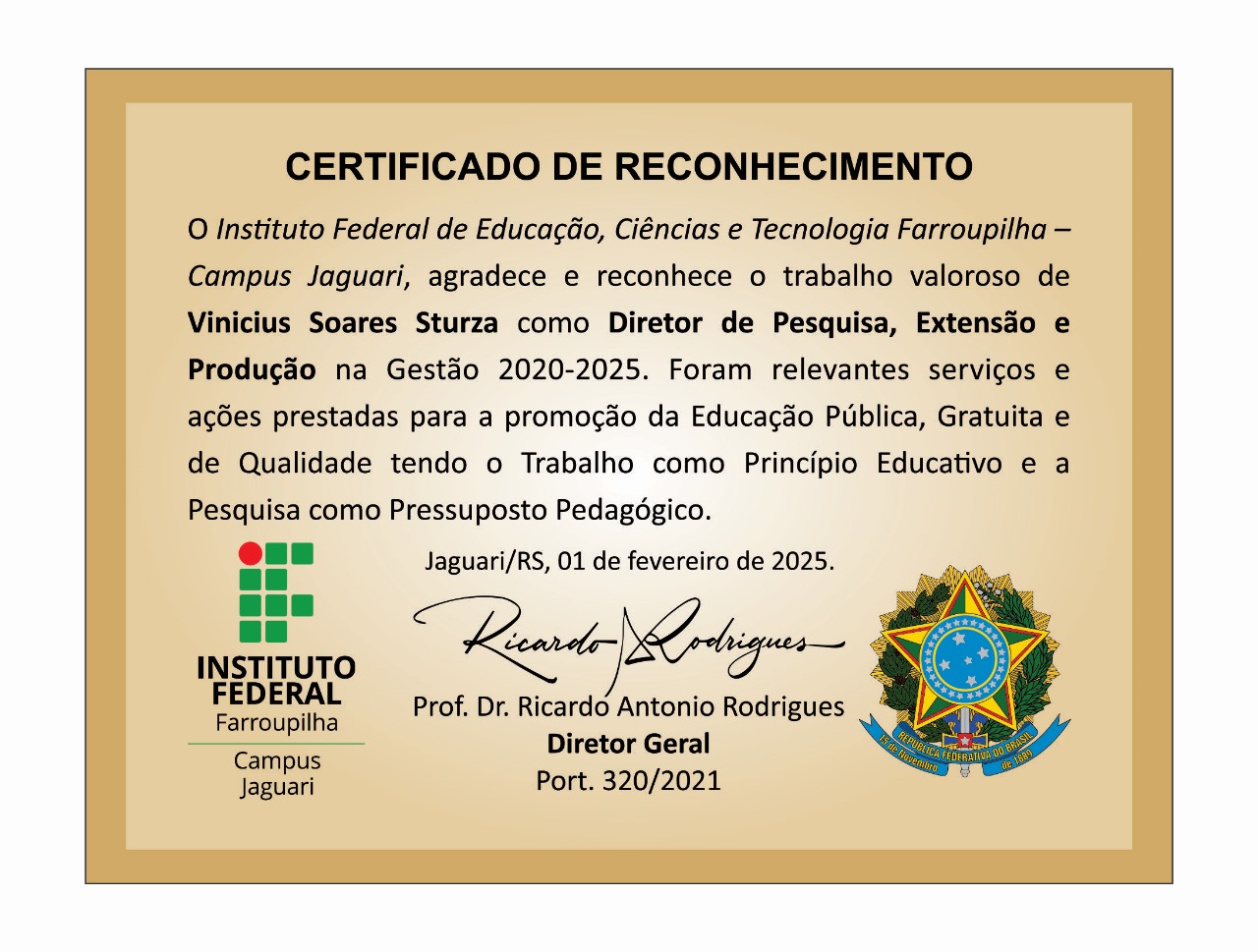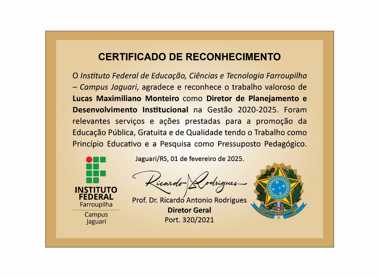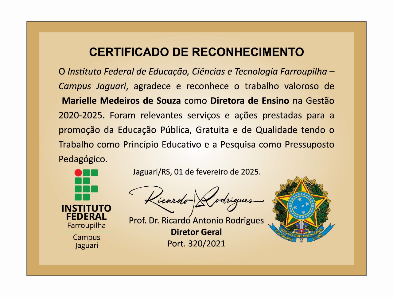 Na tarde de terça-feira, 11 de fevereiro, os diretores sistêmicos da gestão 2021-2025 foram homenageados pelo trabalho realizado durante a gestão 2021-2025, em uma cerimônia promovida pelo Diretor Geral do campus Jaguari, Ricardo Antonio Rodrigues. Durante o evento, Ricardo destacou a importância do trabalho em equipe, enfatizando que uma gestão eficaz não é realizada isoladamente, e que o esforço e dedicação de cada diretor foram fundamentais para o desenvolvimento de diversas ações ao longo desse período. Foram homenageados a Diretora de ensino Marielle Medeiros de Souza, o Diretor de Desenvolvimento e Planejamento e Desenvolvimento Institucional Lucas Maximiliano Monteiro, Diretor de Pesquisa, Extensão e Produção Vinícius Soares Sturza e o Diretor de Administração Romerson Seidel Gibicoski.