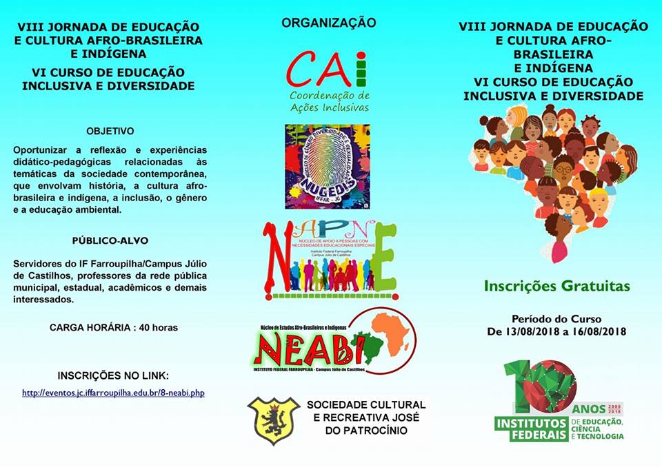 Estão abertas até dia 12, as inscrições para a VIII Jornada de Educação e Cultura Afro- Brasileira e Indígena VI Curso de Educação Inclusiva e Diversidade. O evento é uma promoção da Coordenação de Ações Inclusivas do Campus Júlio de Castilhos, através do NEABI, NAPNE e NUGEDIS, em parceria com a Sociedade Cultural e Recretiva José do Patrocínio.sob a coordenação do professor Aristeu Castilhos da Rocha. As inscrições podem ser feitas através do link:http://eventos.jc.iffarroupilha.edu.br/8-neabi.php.