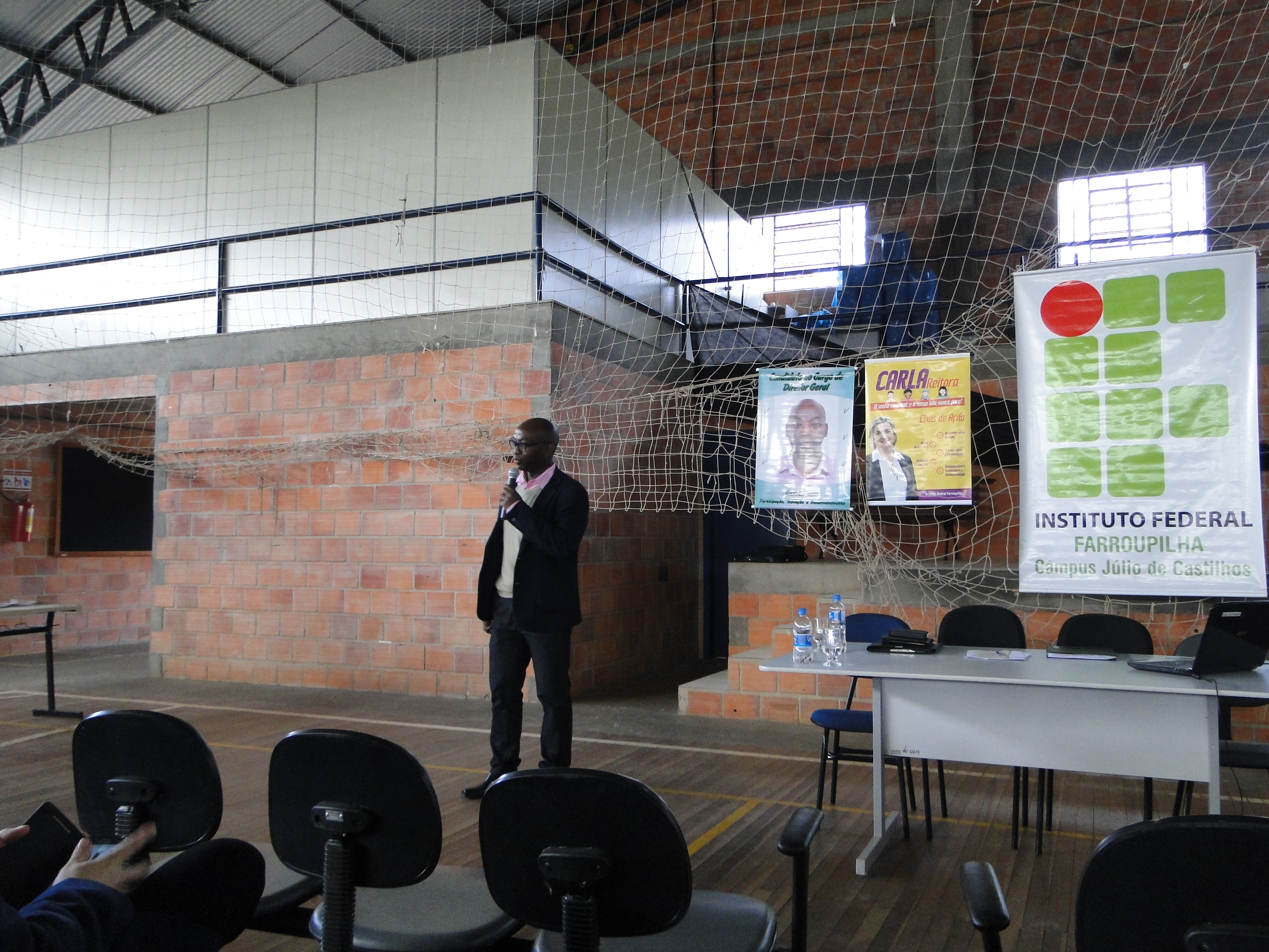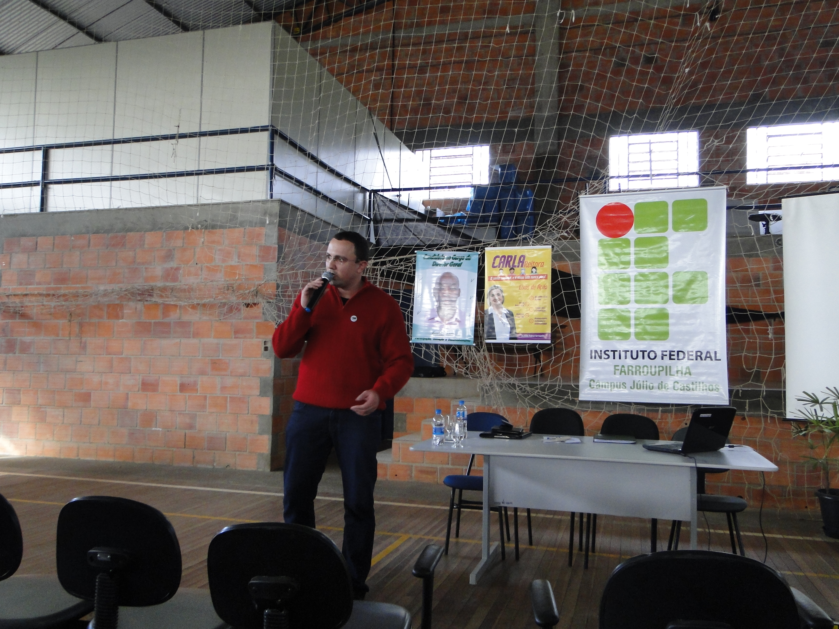 Já no Campus, temos dois candidatos: o professor Paulino Varela Tavares e o psicólogo Rodrigo Carvalho Carlotto. A apresentação das propostas aconteceu na terça-feira (14/06) e em momentos diferentes para servidores (durante a tarde) e estudantes (no intervalo da manhã e da noite).