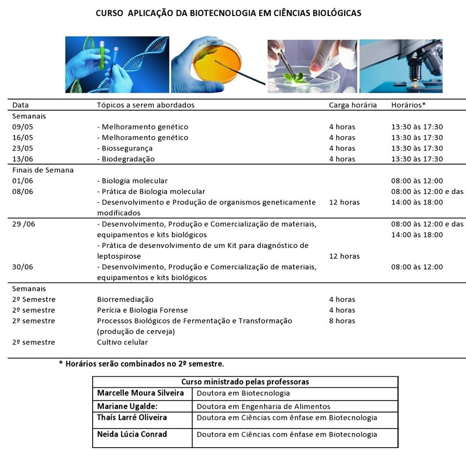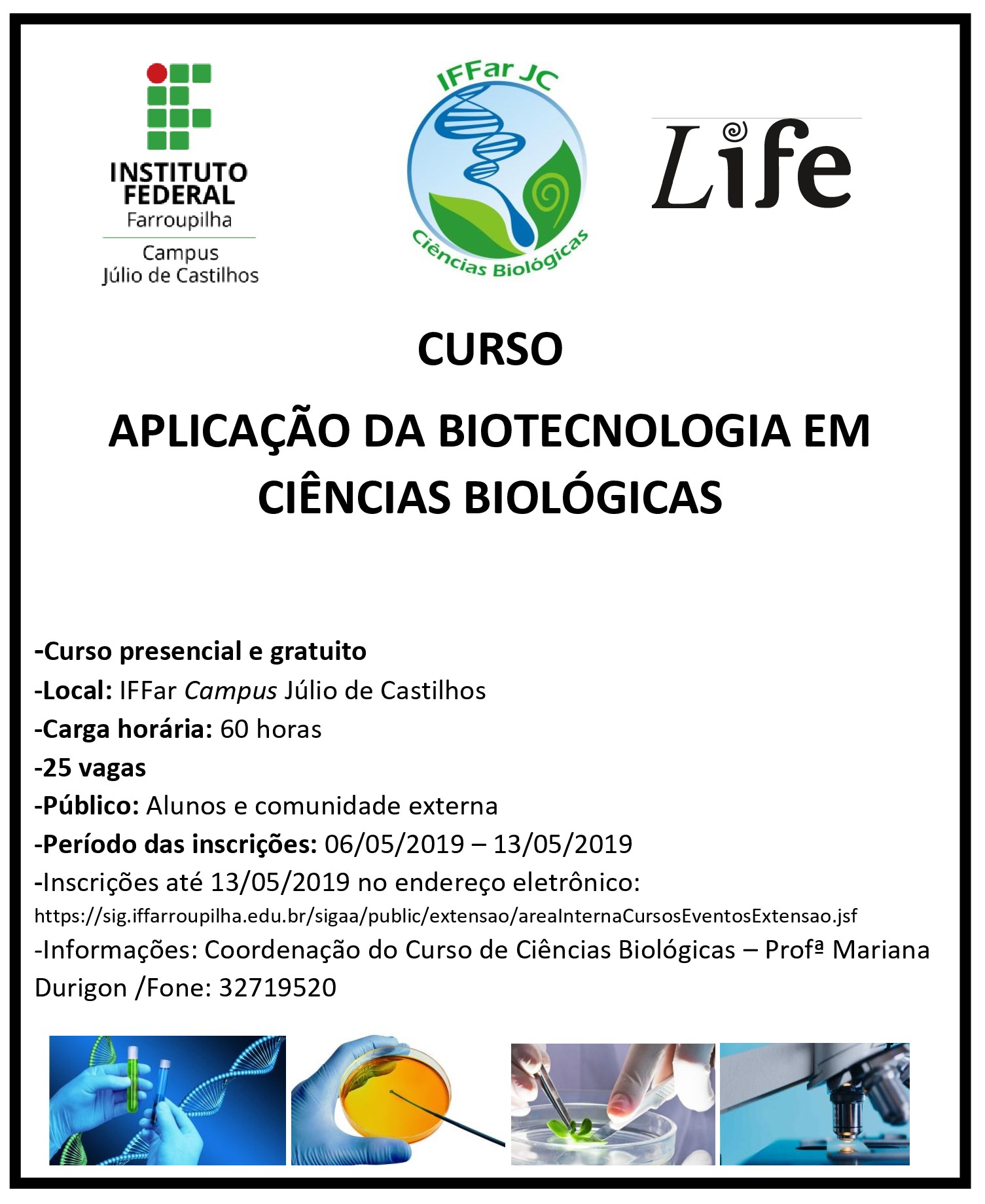 Estão abertas até dia 13 de maio as inscrições para o Curso de Aplicação da Biotecnologia em Ciências Biológicas. A atividade é uma promoção do Curso de Licenciatura em Ciências Biológicas, do Iffar - Campus Júlio de Castilhos e é dirigido aos estudantes e professores da área e pessoas da comunidade que tenham conhecimentos básicos de genética. Tem como objetivos, promover reflexões e debates sobre as aplicações biotecnológicas; conhecer as inúmeras oportunidades de atuação do Licenciado e/ou bacharel em Ciências Biológicas na área de biotecnologia e contribuir com a formação continuada de professores, principalmente de Ciências Biológicas.