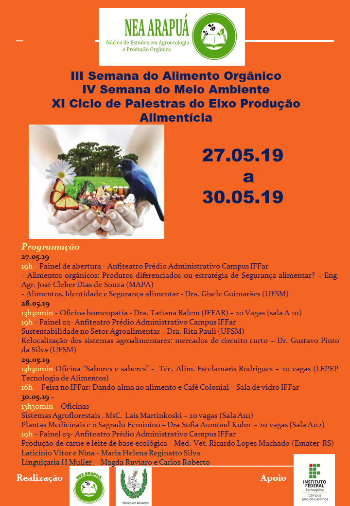 De 27 a 30 de maio acontece, no Iffar/Campus Júlio de Castilhos, a III Semana do Alimento Orgânico, IV Semana do Meio Ambiente e XI Ciclo de Palestras do Eixo de Produção Alimentícia. O evento é uma promoção conjunta do Núcleo de Estudos em Agroecologia - NEA Arapuã e Eixo Tecnológico de Gestão Alimentícia.