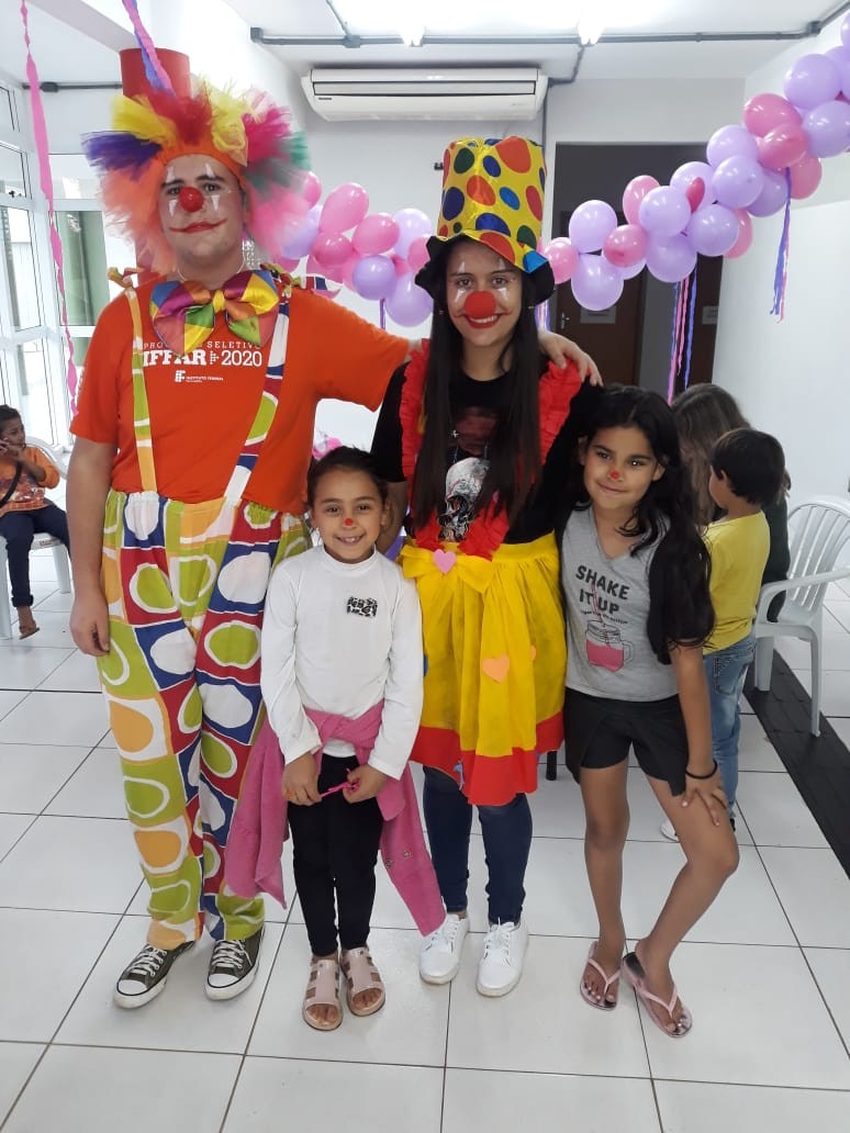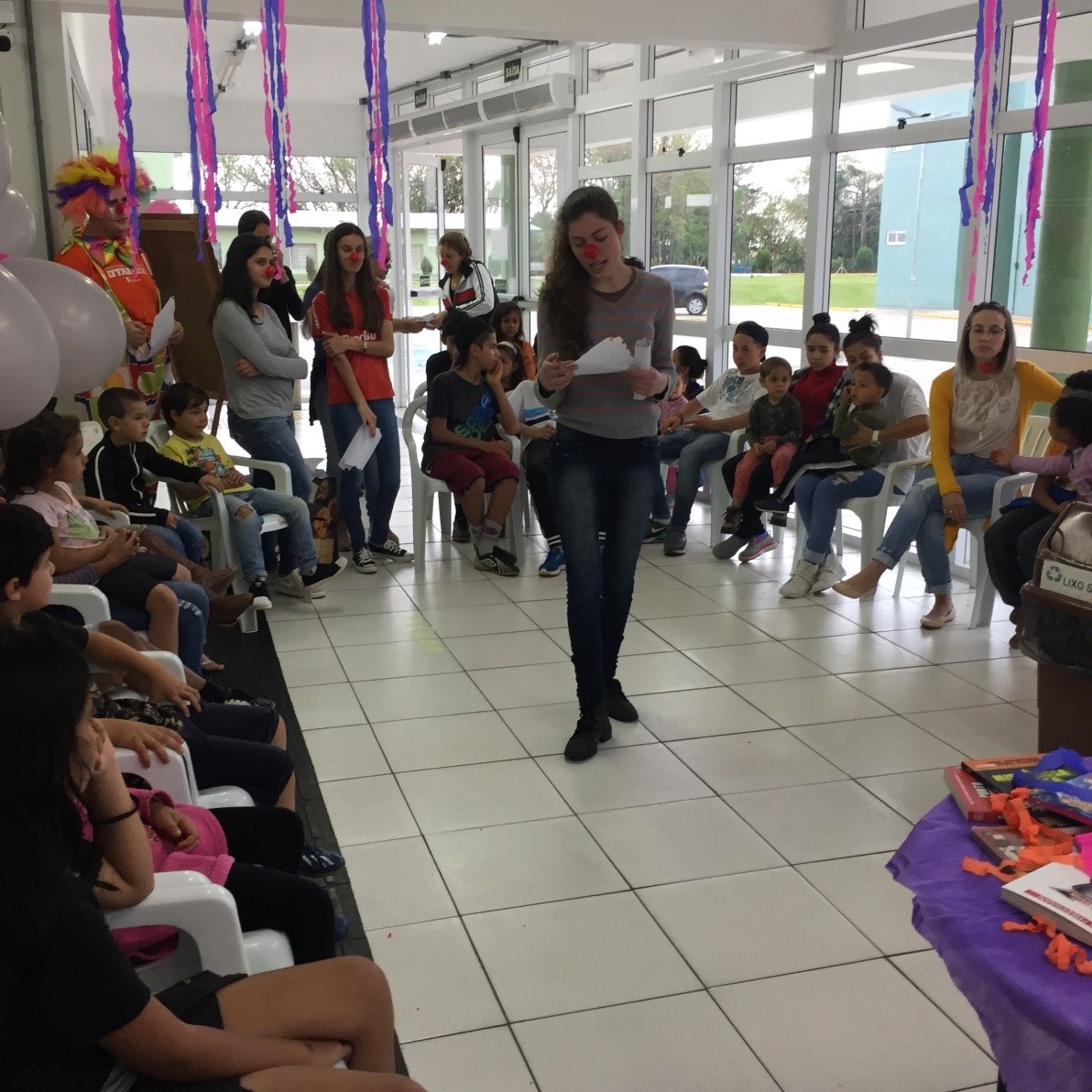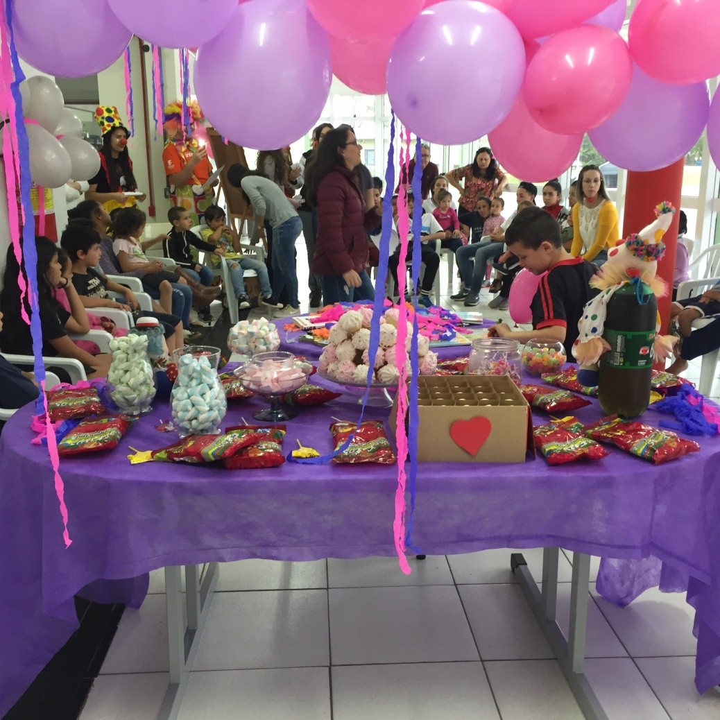 No dia 17 de outubro, foi festejado o dia da criança com os participantes do projeto Kombi Teca: leitura e Diversão, no hall da biblioteca do campus. As crianças foram recebidas em um ambiente preparado pela equipe e voluntários do projeto, com palhaços, balões, contação de história e muitos doces.