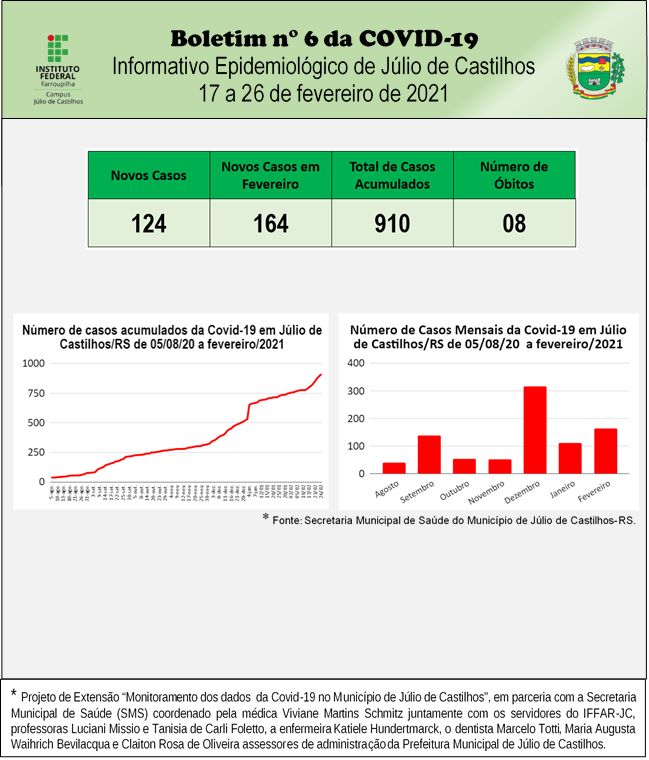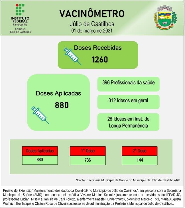 O Instituto Federal Farroupilha Campus Júlio de Castilhos (IFFAR-JC), por meio do Projeto de Extensão “Monitoramento dos dados  da Covid-19 no município de Júlio de Castilhos", em parceria com a Secretaria Municipal de Saúde (SMS) apresenta os dados sobre a infecção pelo novo coronavírus no município no 6º Relatório Epidemiológico. Este conta com o "Vacinômetro", que destaca o acompanhamento da vacinação contra a Covid-19 em Júlio de Castilhos.