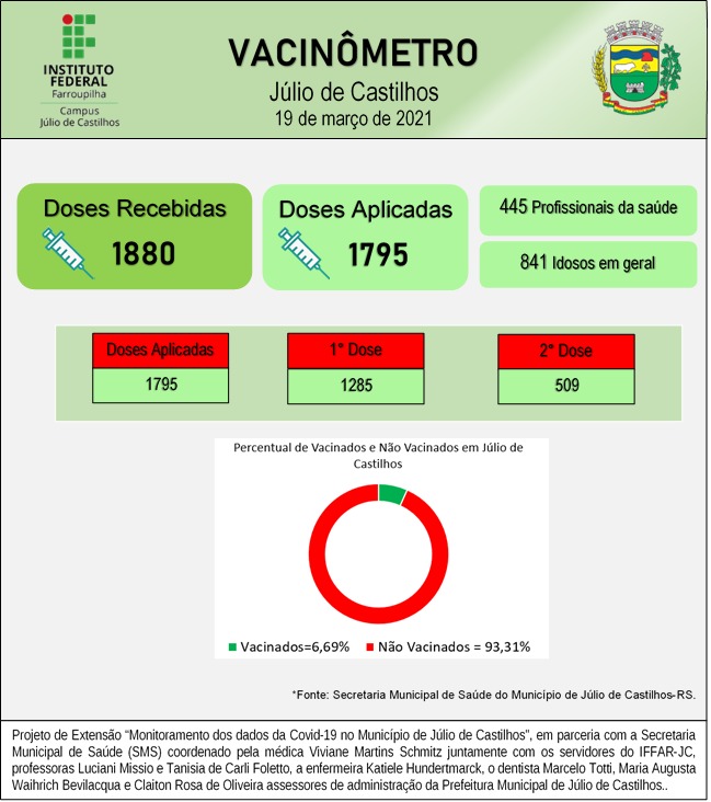 O Instituto Federal Farroupilha Campus Júlio de Castilhos (IFFar-JC), por meio do Projeto de Extensão “Monitoramento dos dados da Covid-19 no município de Júlio de Castilhos", em parceria com a Secretaria Municipal de Saúde (SMS) apresenta os dados sobre a infecção pelo novo coronavírus no município no 9º Relatório Epidemiológico. Este conta com o "Vacinômetro", que destaca o acompanhamento da vacinação contra a Covid-19 em Júlio de Castilhos.