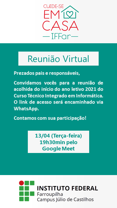 O IFFar Campus Júlio de Castilhos convida pais/responsáveis dos alunos dos Cursos Técnicos Integrados para participarem da reunião de acolhida do ano letivo 2021.