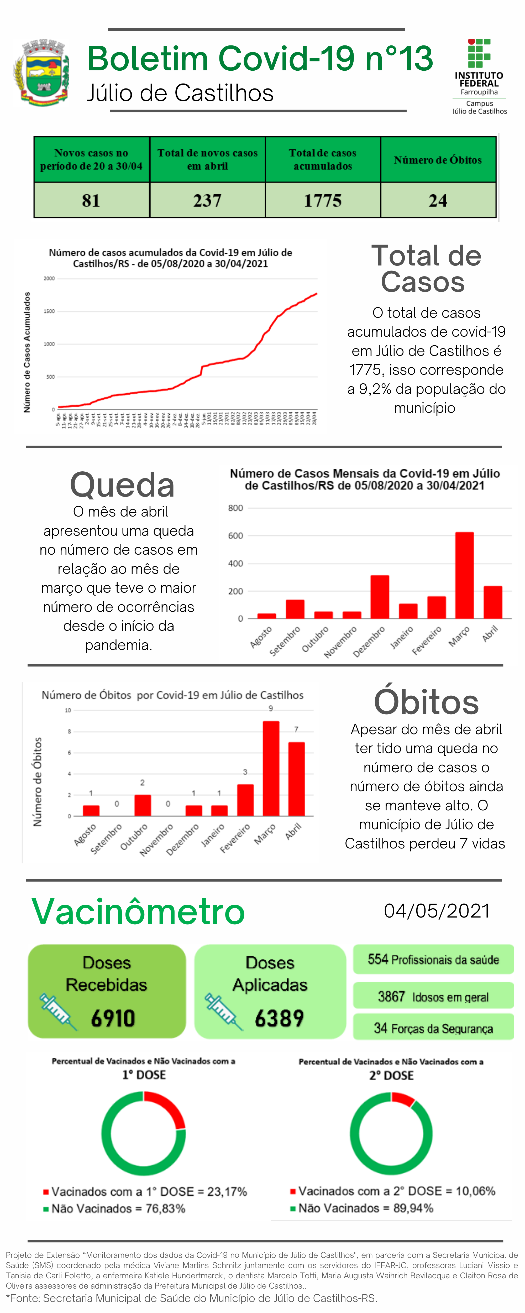 O Instituto Federal Farroupilha Campus Júlio de Castilhos (IFFar-JC), por meio do Projeto de Extensão “Monitoramento dos dados da Covid-19 no município de Júlio de Castilhos", em parceria com a Secretaria Municipal de Saúde (SMS) apresenta os dados sobre a infecção pelo novo coronavírus no município no 13º Relatório Epidemiológico. Este conta com o "Vacinômetro", que destaca o acompanhamento da vacinação contra a Covid-19 em Júlio de Castilhos.