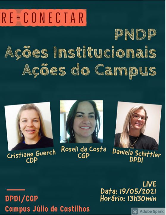 Na próxima quarta-feira(19), às 13h30min, o IFFar Campus Júlio de Catilhos retoma o projeto RE-CONECTAR, com live divulgando o PNDP(Política Nacional de Desenvolvimento de Pessoas), Ações Institucionais e Ações no Campus JC.